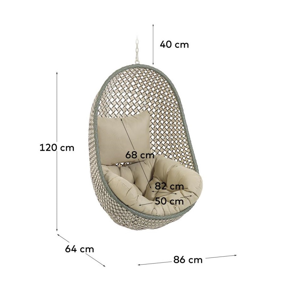 Rozsiądź się wygodnie w dołączonych poduszkach i poczuj, jak codzienne chwile relaksu stają się wyjątkowo komfortowe. Zielony fotel wiszący Cira to nie tylko mebel, ale także sposób na odprężenie i odpoczynek w otoczeniu naturalnych elementów. Dzięki jego solidnej konstrukcji i wysokiej jakości materiałom możesz cieszyć się nim przez wiele sezonów, niezależnie od warunków atmosferycznych.