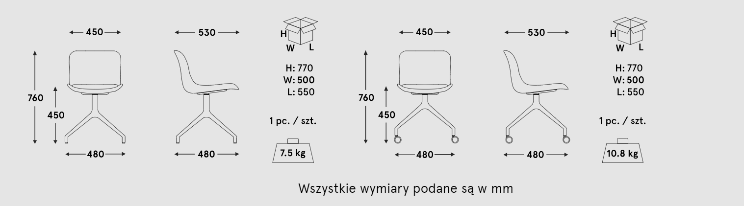Krzesło jest dostępne w różnych wariantach kolorystycznych na poziomie siedziska i podstawy. W celu uzyskania dodatkowych informacji o możliwościach konfiguracji prosimy o kontakt telefoniczny.