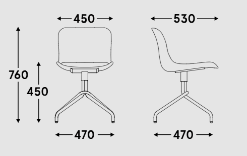 Podstawa: 4-ro ramienna metalowa, malowana proszkowo, siedzisko obrotowe - 360°, nogi z rury Ø22 mm, kółka do powierzchni miękkich lub twardych
