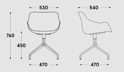 Podstawa: 4-ro ramienna metalowa, malowana proszkowo, siedzisko obrotowe - 360°, nogi z rury Ø22 mm, stopki tworzywowe