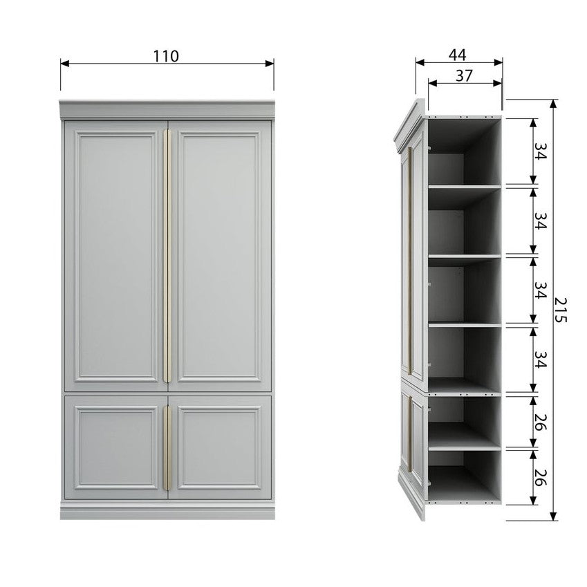 Drzwi ozdabiają efektowne listwy i metalowy uchwyt na całej długości drzwi w kolorze antycznego mosiądzu. Efektowne uchwyty przełamują klasyczny wygląd szafy, dodając jej nowoczesnego charakteru. Wnętrze szafy standardowo posiada zawieszkę oraz 1 półkę na całej szerokości szafy. W dolnej części szafy za dwoma mniejszymi drzwiami znajduje się również 1 szeroka półka na całej szerokości szafy.