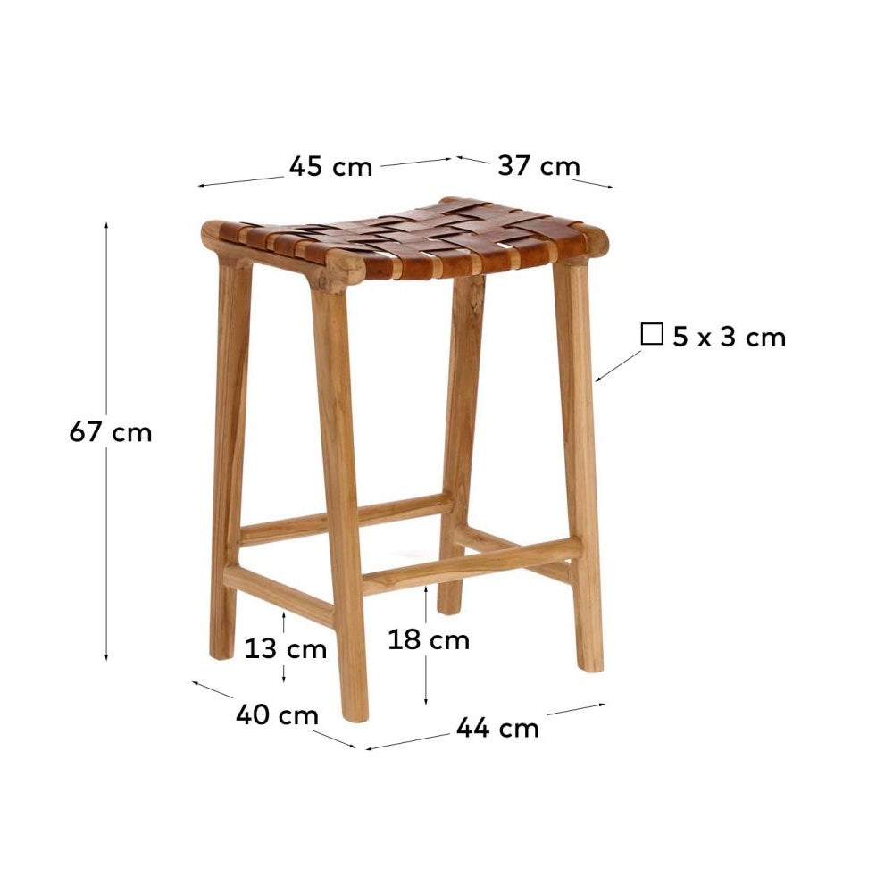Stołek barowy Calixta to wyjątkowy mebel, który łączy w sobie doskonałe rzemiosło z niepowtarzalnym stylem. Został stworzony z litego drewna tekowego, co nie tylko nadaje mu trwałość, ale także podkreśla jego naturalne piękno. Ręcznie plecione skórzane paski dodają elegancji i wyrafinowania, tworząc unikalny wzór, który przyciąga wzrok.