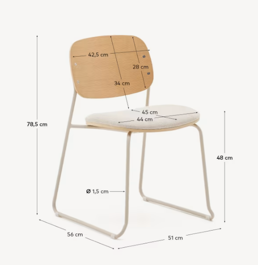 Oparcie wykonane z forniru z drewna topoli nadaje mu subtelny, organiczny wygląd, natomiast tapicerowane szenilową tkaniną siedzisko zapewnia wysoki komfort użytkowania. Beżowe nogi z mikroteksturowanego metalu dodają całości nowoczesnego charakteru, jednocześnie gwarantując trwałość i stabilność.