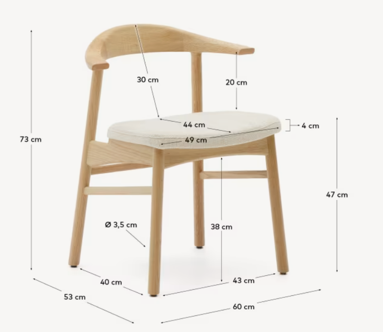 Siedzisko tapicerowane tkaniną szenilową o miękkiej strukturze i ciepłym odcieniu dodaje meblowi przytulności. Poszewka zapinana na sznurek oraz możliwość jej rozpięcia ułatwiają czyszczenie, czyniąc krzesło Timons praktycznym wyborem do codziennego użytku. Piankowe wypełnienie o gęstości 30 kg/m³ zapewnia komfort siedzenia, a całość wykonana jest z materiałów pochodzących ze zrównoważonych źródeł – potwierdzonych certyfikatem FSC Mix Credit.