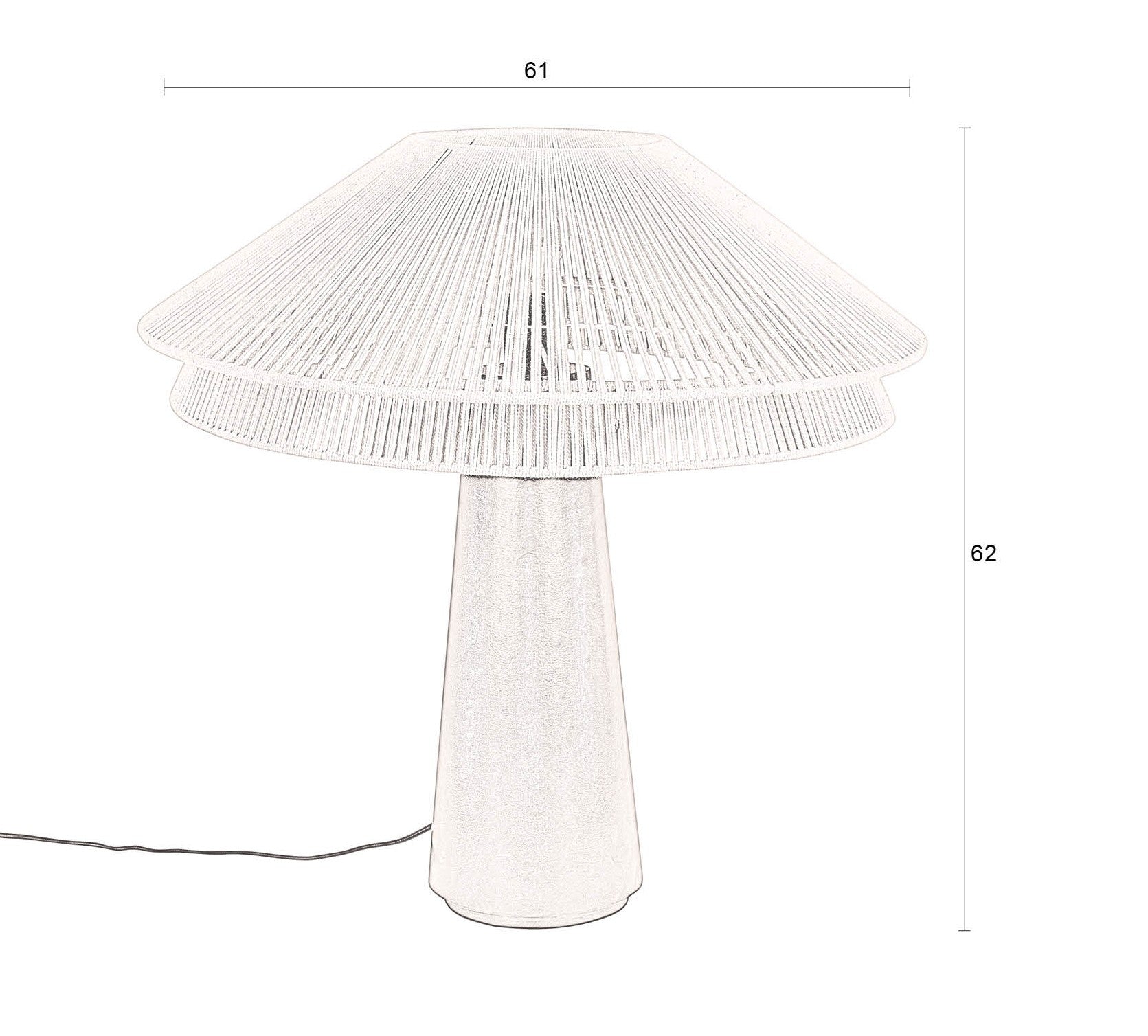 Dzięki lampie stołowej Elon dodasz swojemu wnętrzu zarówno charakteru, jak i atmosfery. Ta wyjątkowa lampa wyróżnia się natychmiast dzięki kontrastowi między kolorami i materiałami. Lampa jest wykonana z czarnego metalu, a jej klosz ze skręconej liny. Połączenie jasnego i ciemnego oraz naturalnego materiału z metalem tworzy niepowtarzalny wygląd.
