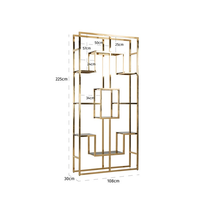 Złoty regał Florence stanowi ciekawe połączenie stylu art deco oraz glamour. Dzięki charakterystycznym połączeniom układającym się w finezyjne kształty regał jest nie tylko elegancki, ale również nowoczesny. Czarne szkło wykorzystane do stworzenia półek kontrastuje z metalowymi elementami, sprawiając jednocześnie wrażenie idealnego dopasowania.