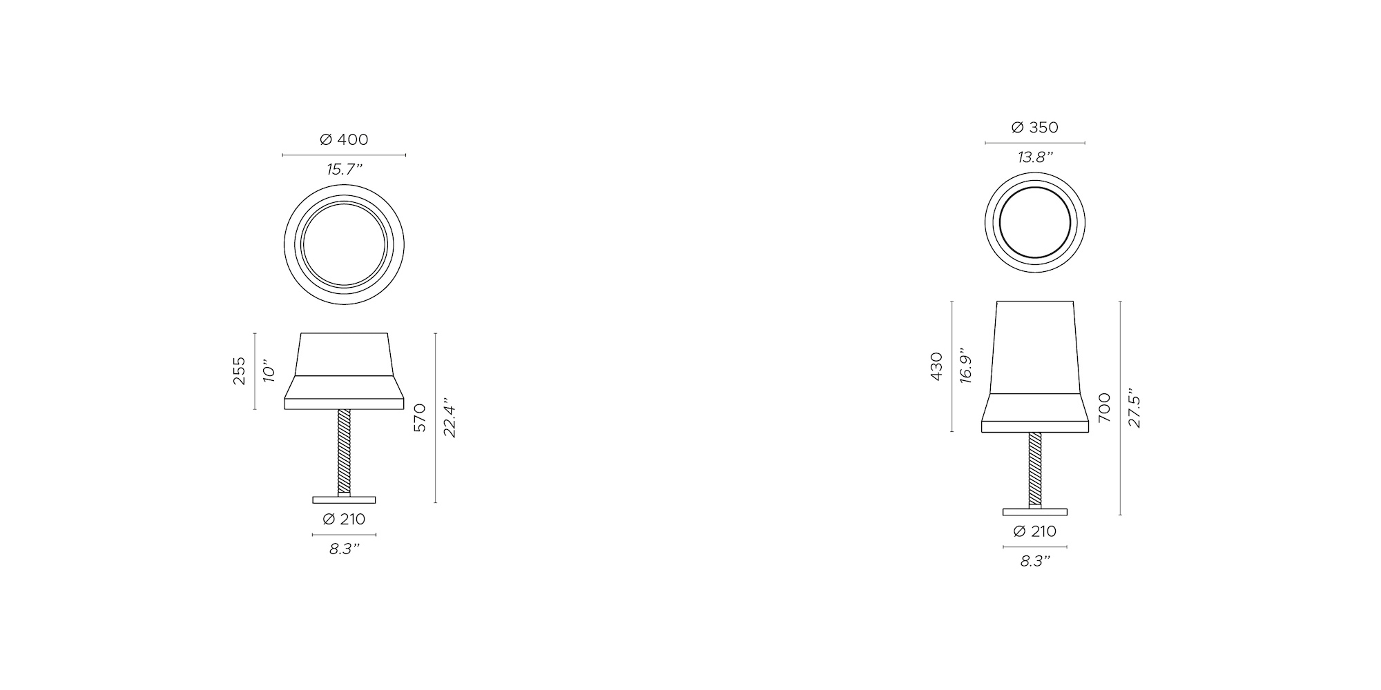Kolekcja Audrey, złożona z dwóch wersji stołowych, wersji podłogowej i wiszącej, została zaprojektowana jako prawdziwe ćwiczenie stylu. Łączą się ze sobą trzy odcienie: bawełna w górnej i dolnej części, tkanina san color bouclé w środkowej części oraz nowe aksamitne wykończenia, dostępne w różnych kolorach. Nóżka pokryta jest plecionym jedwabnym sznurkiem.