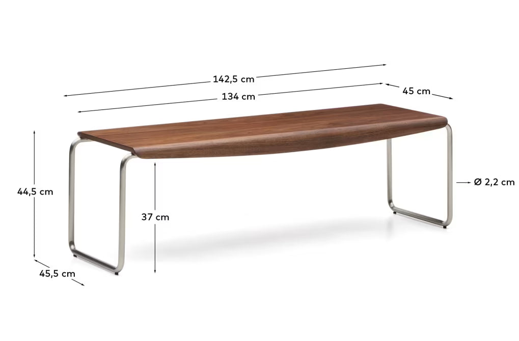 Ławka posiada konstrukcję opartą na stali nierdzewnej ze szczotkowanym wykończeniem, co nadaje jej nowoczesny charakter i odporność na użytkowanie. Siedzisko zostało wykonane ze sklejki niskoemisyjnej E0, wykończonej fornirem orzechowym o grubości 0,6 mm i zabezpieczonej lakierem PU. Certyfikat FSC™ 100% gwarantuje odpowiedzialne pochodzenie drewna. Nogi wykonane są ze stali nierdzewnej, zakończone podkładkami z tworzywa sztucznego i filcu, co chroni podłogę przed zarysowaniami. Ławka Tarsel to solidne i eleganckie rozwiązanie, które dzięki swojej formie i materiałom idealnie wpasuje się w nowoczesne wnętrza.