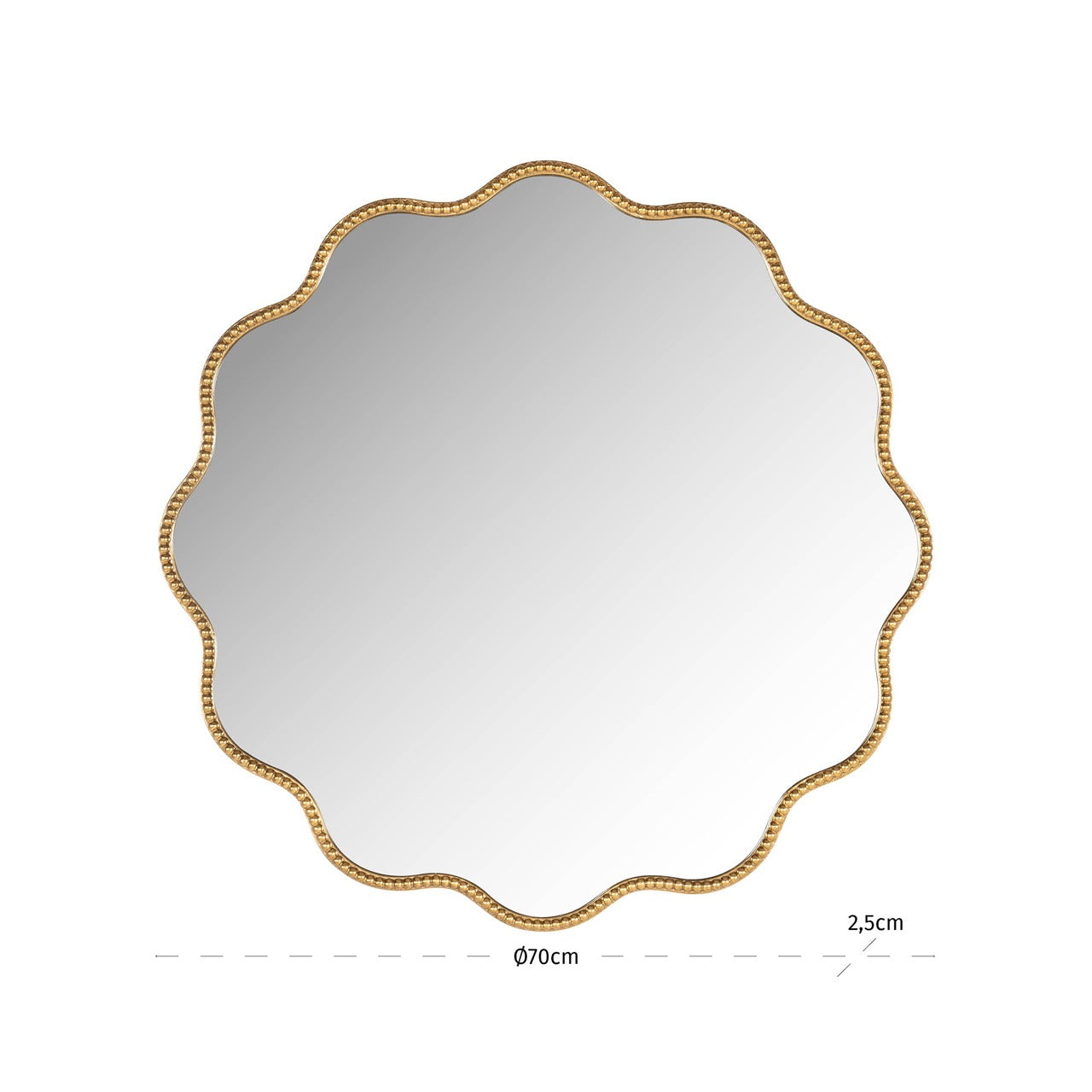 Solidna konstrukcja z żelaza i MDF w połączeniu z wysokiej jakości lustrem gwarantuje trwałość i piękny wygląd przez długie lata. Dzięki dekoracyjnemu kształtowi i złotemu odcieniowi lustro nie tylko rozświetla przestrzeń, ale również optycznie ją powiększa, czyniąc wnętrze bardziej przytulnym.