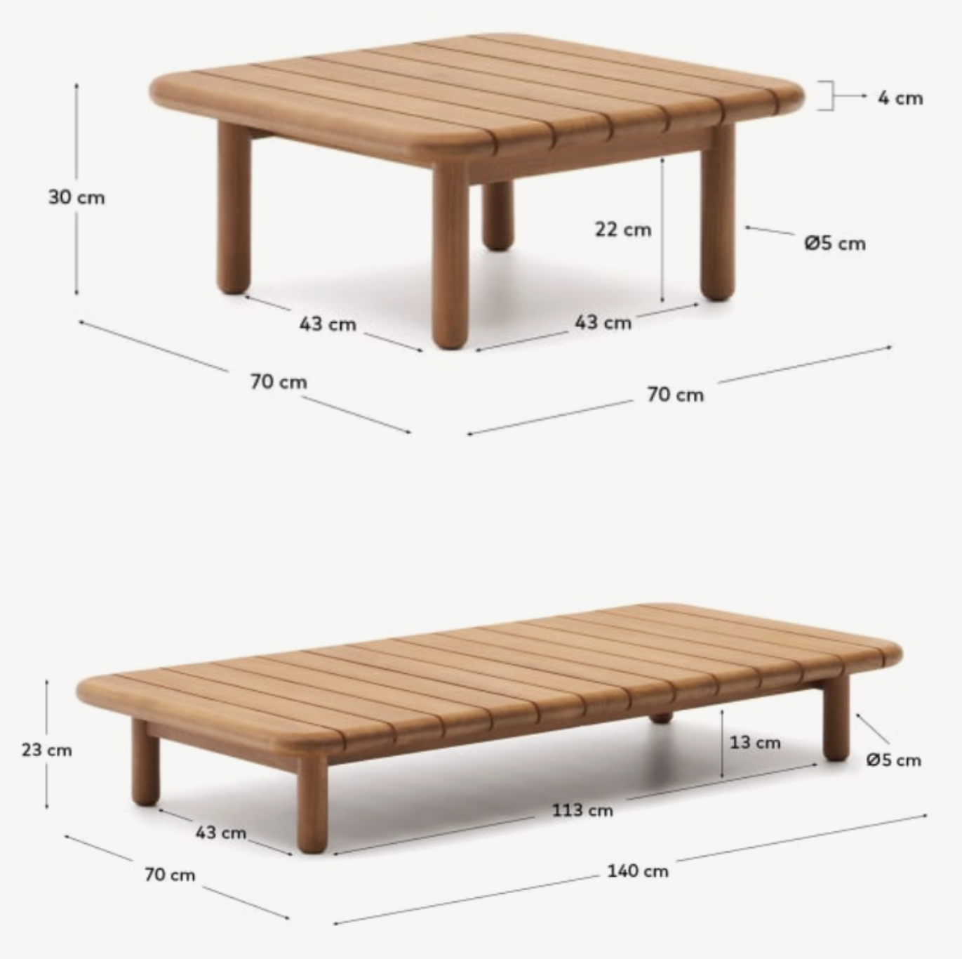Kolekcja Turqueta wykonana została z litego drewna tekowego, co nadaje jej nie tylko elegancki wygląd, ale także niezrównaną wytrzymałość i trwałość. Drewno tekowe jest cenione nie tylko ze względu na swoją odporność na warunki atmosferyczne, ale także za swoje delikatne odcienie, które dodają uroku każdemu meblowi. Dzięki temu stolik kawowy Turqueta doskonale sprawdzi się zarówno na tarasie, w ogrodzie, jak i w wilgotnych pomieszczeniach, bez obawy o jego stan czy wygląd.