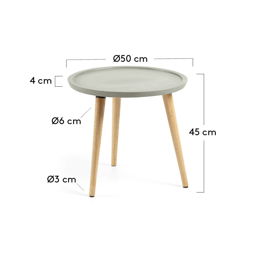 Stolik Lucy składający się z cementowego blatu i stopy z drewna kauczukowego. Designerski dodatek z okrągłym blatem w stylu tacy wykonanym z cementu, odporny na warunki atmosferyczne. Modny stolik do użytku wewnątrz na zewnątrz.