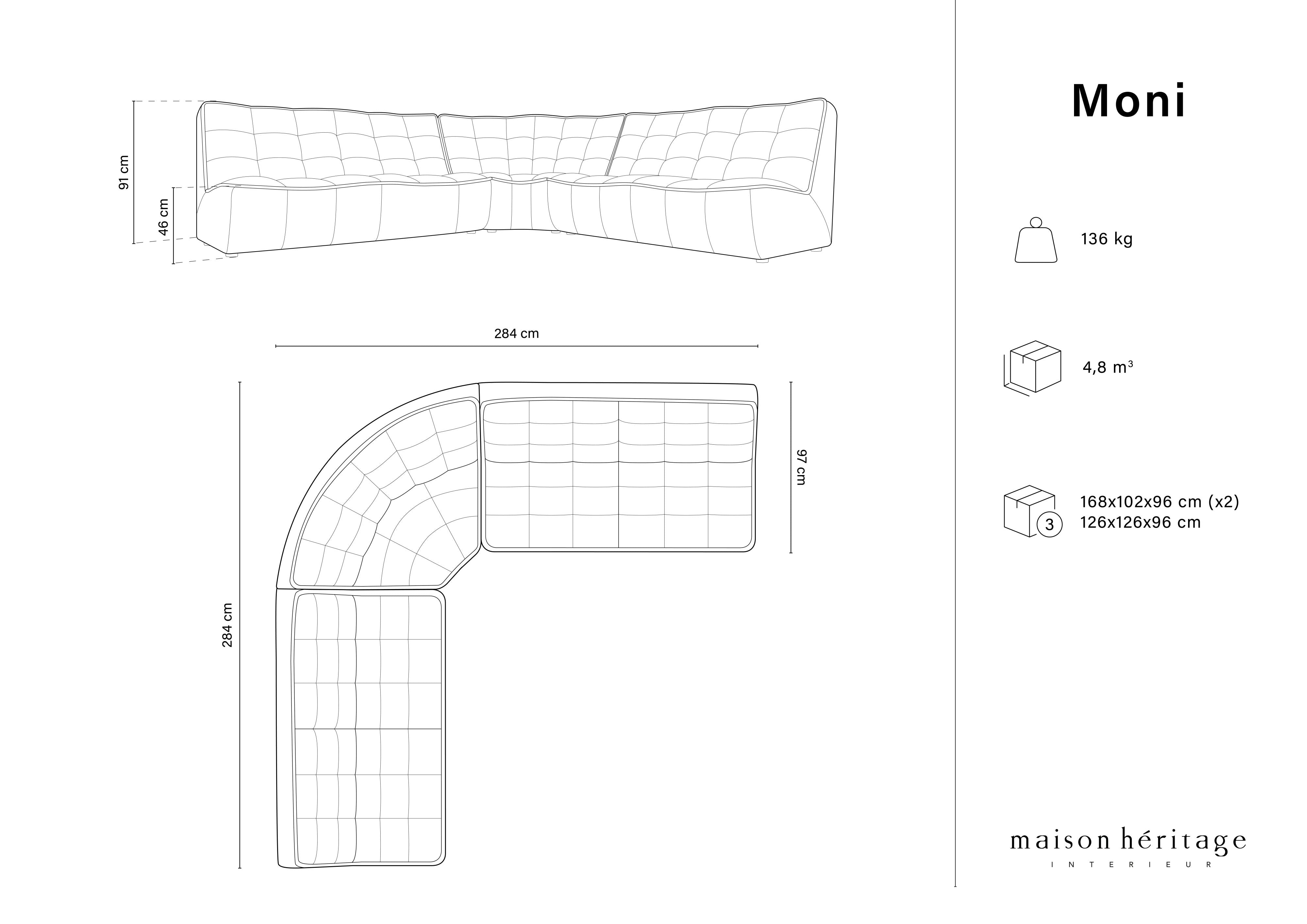 Tapicerka z naturalnej skóry bydlęcej jest delikatnie tłoczona, dzięki czemu jej struktura jest bardzo przyjemna w dotyku. Ergonomiczne kształty zapewniają swobodne podparcie całych pleców. Kolekcja Moni obejmuje kilka kombinacji sof i narożników, a także elementy takie jak fotele, szezlongi i pufy.