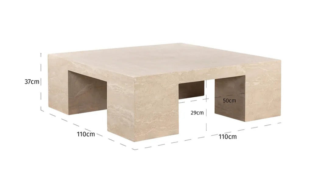 Nowoczesny stolik kawowy Biltmore o kwadratowym blacie to połączenie surowego piękna kamienia z industrialnym wykończeniem żelaznym. Blat z naturalnego trawertynu zachwyca unikalnym rysunkiem i szlachetną strukturą, a masywna podstawa z żelaza zapewnia stabilność i charakterystyczny, minimalistyczny wygląd. To mebel, który wprowadza do wnętrza luksus, zachowując przy tym prostotę formy.