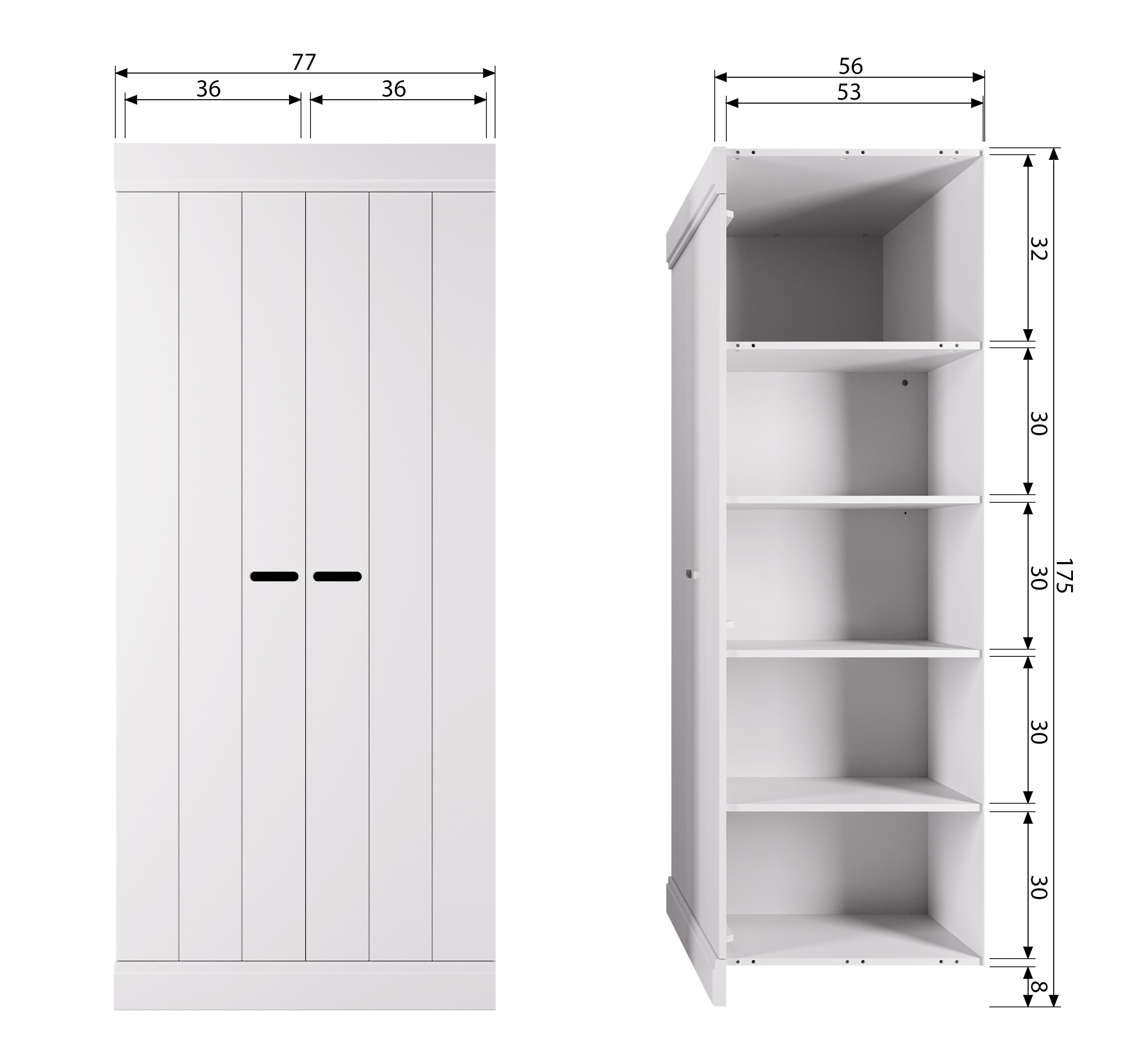 Biała szafa Connect jest wykonana z wytrzymałych materiałów, które zapewniają jej długowieczność i trwałość. Wewnątrz posiada jedną dużą półkę oraz miejsce na wieszaki. Jest także opcja z dodatkowymi półkami, dzięki której pomieścisz więcej drobiazgów.