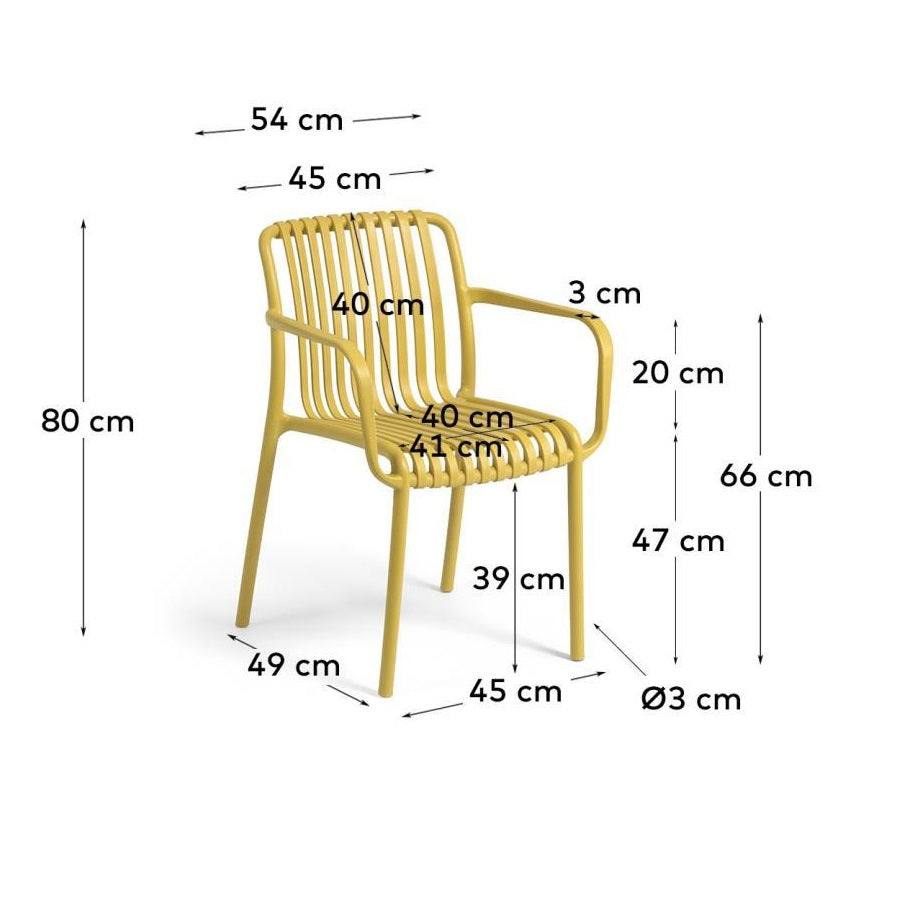 Wykonane z plastiku nadającego się do recyklingu, żółte krzesło Isabellini stanowi doskonały wybór dla tych, którzy dbają o środowisko. Jego trwała konstrukcja sprawia, że jest odporne na działanie promieniowania UV, co czyni je idealnym meblem do użytku na zewnątrz, bez względu na warunki atmosferyczne.