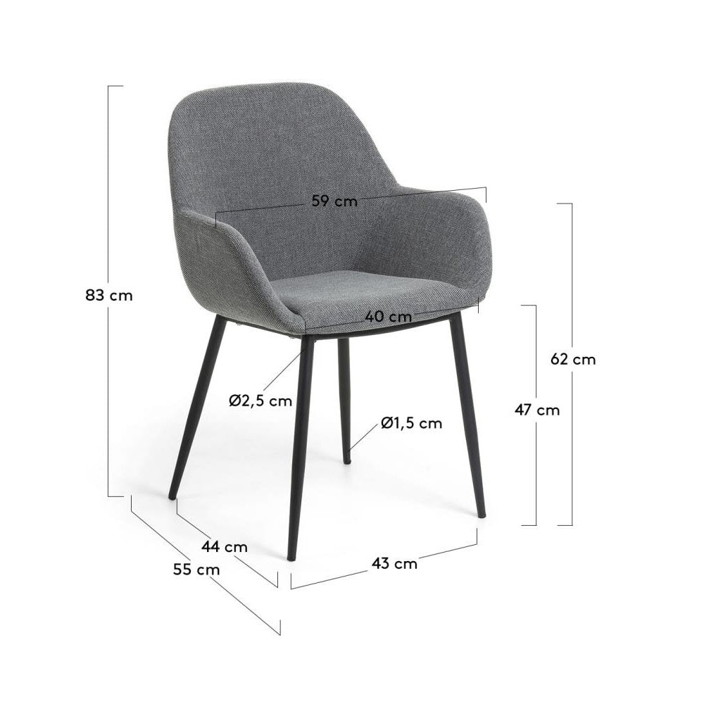 Metalowe nogi z czarnym wykończeniem stanowią kontrastujący, nowoczesny element, który nadaje krzesłu charakteru i stabilności. To połączenie współczesnego designu i wyjątkowego materiału sprawia, że krzesło Konna nie tylko spełnia swoje funkcje użytkowe, ale staje się również ozdobą pomieszczenia.