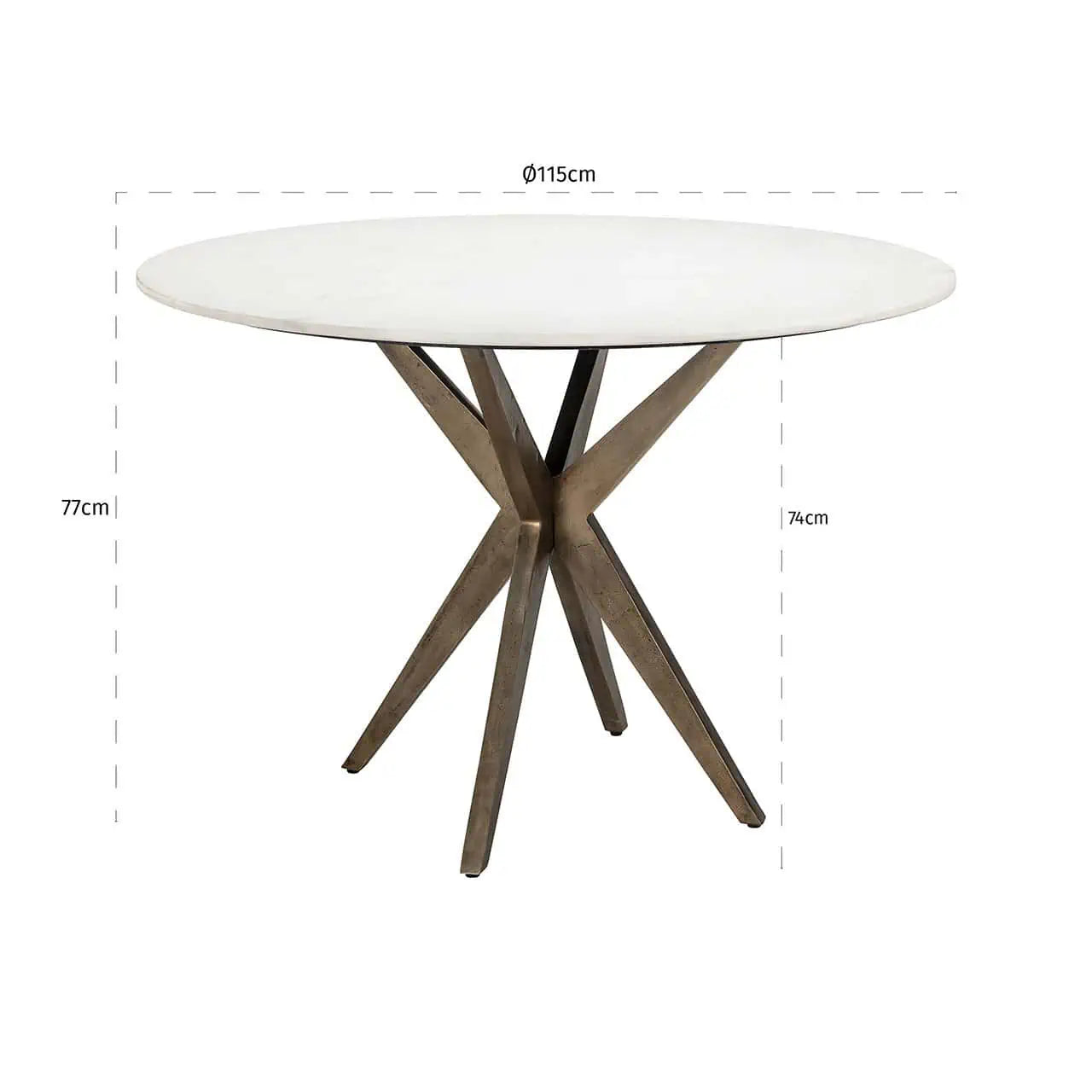 Okrągły blat o średnicy 114 cm nadaje stołowi harmonijną estetykę. Stół o wysokości 76 cm oferuje idealną wysokość do spożywania posiłków i jest idealny do wspólnych posiłków. Powierzchnia marmuru jest nie tylko atrakcyjna, ale także łatwa w utrzymaniu. Stół do jadalni Maisy został starannie wykonany i spełnia najwyższe standardy stabilności i estetyki. Stół do jadalni idealnie nadaje się do jadalni, kuchni lub jako stylowy element w salonie. Dzięki wysokiej jakości materiałom i ponadczasowemu wzornictwu pasuje do różnych stylów wyposażenia wnętrz