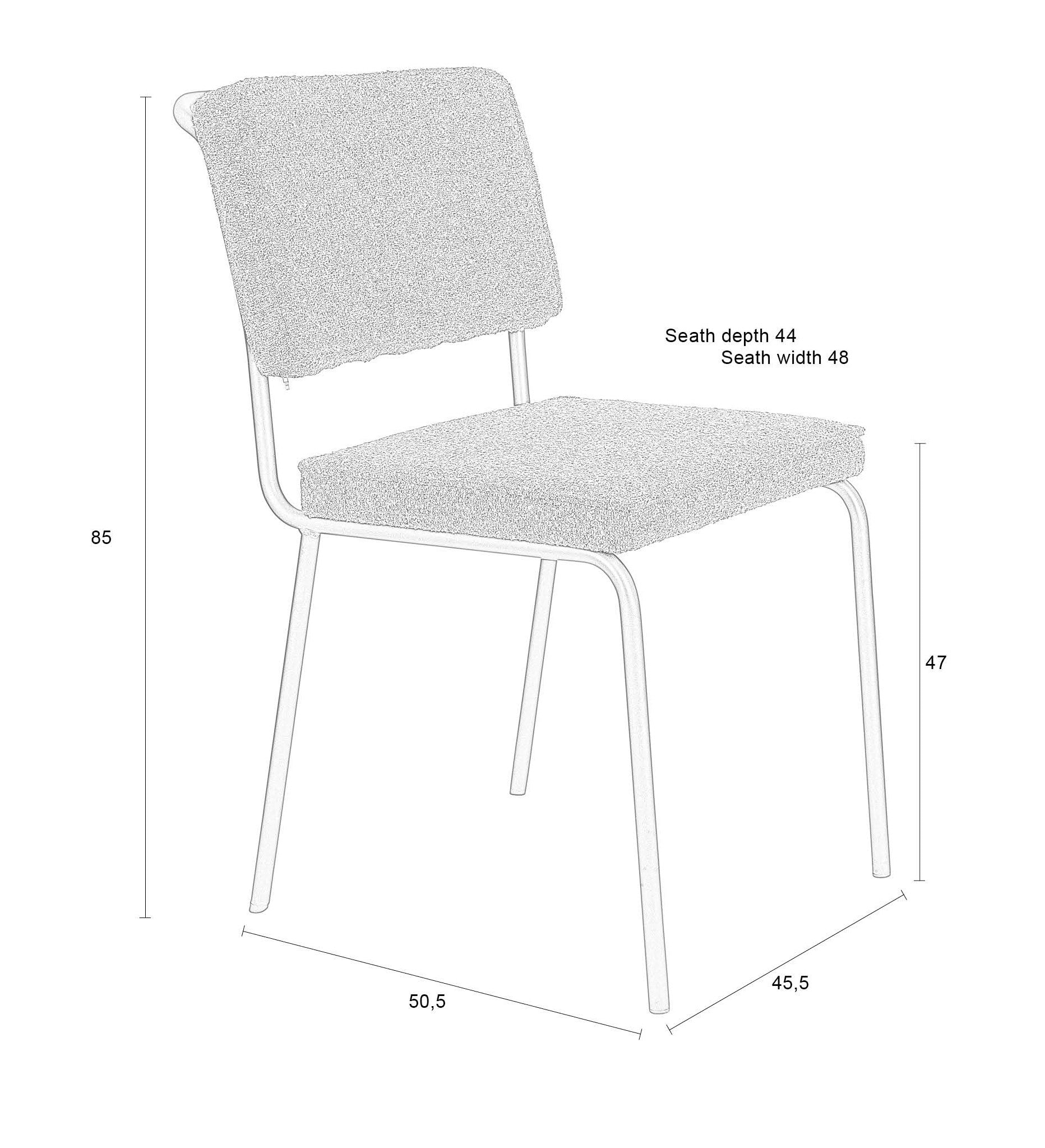 Krzesło Buddy zostało zaprojektowane z myślą o wygodzie, posiada lekką ramę i miękką tapicerkę z tkaniny boucle. Tapicerka wykonana jest w 100% z materiałów pochodzących z recyklingu, co czyni krzesło ekologicznym wyborem. Rama krzesła płynnie przechodzi w uchwyt znajdujący się z tyłu, co dodaje mu ergonomicznego detalu oraz ułatwia manewrowanie.