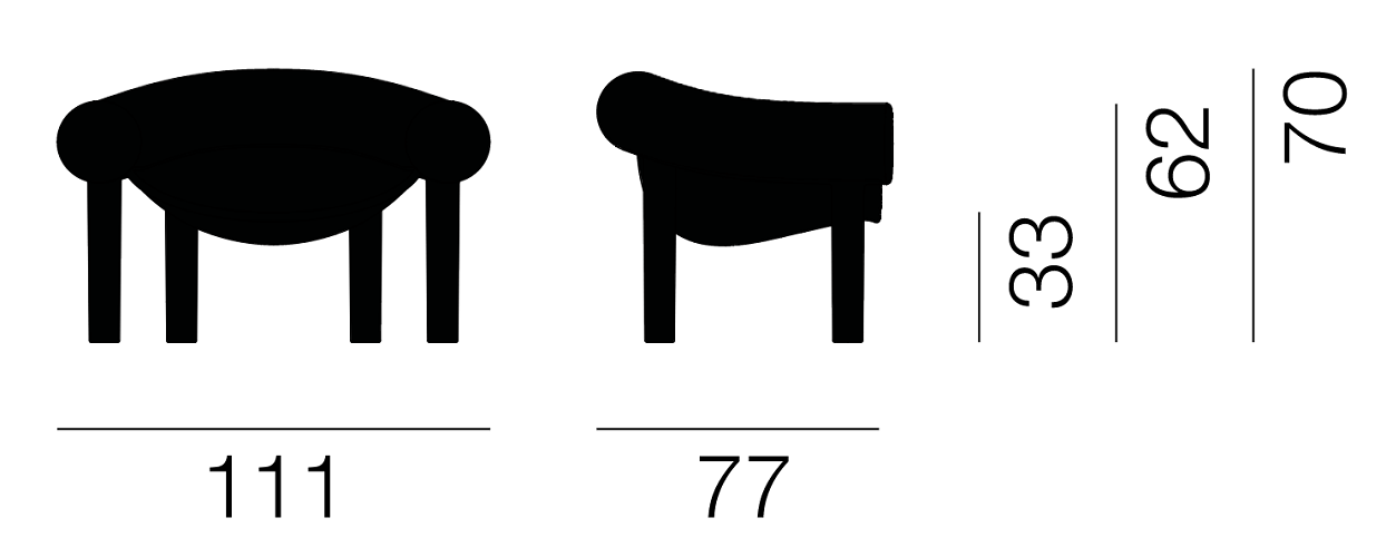 Siedzisko fotela jest miękko zawieszone między dwoma elementami w kształcie podkowy, które tworzą charakterystyczne podłokietniki i oparcie. Fotel wykonany jest z dwóch różnych form obrotowych, co pozwoliło na zastosowanie sztywnego tworzywa sztucznego dla podstawy i bardziej elastycznego polimeru dla górnej części, zapewniając wygodne i ergonomiczne siedzenie.