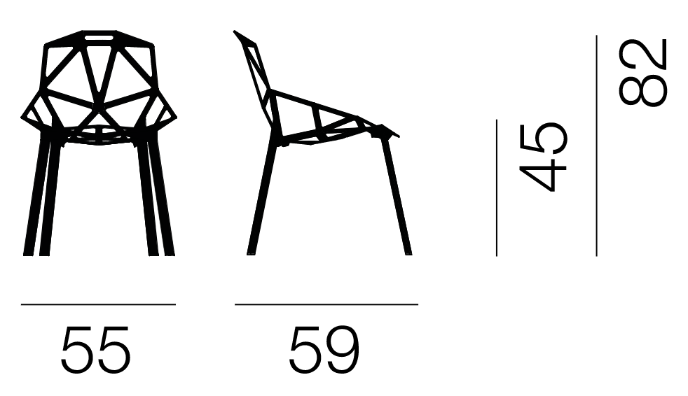 Krzesło Chair_One zostało wykonane z trwałych i wytrzymałych materiałów, co zapewnia jego trwałość i odporność na uszkodzenia. Konstrukcja krzesła opiera się na trójkątnych kształtach, co nadaje mu nowoczesnego i niebanalnego charakteru. Podstawa krzesła wykonana jest z betonu, malowanego w kolorze transparentnym naturalnym lub czarnym, co dodaje mu dodatkowej elegancji.