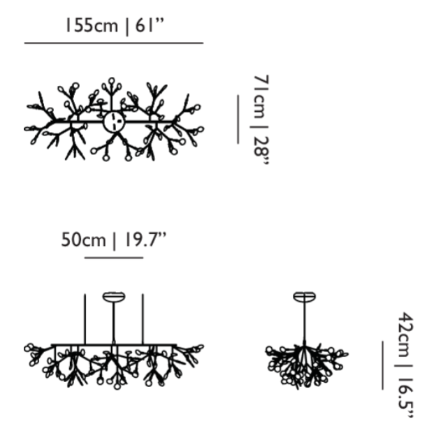 Żyrandol Heracleum III Linear wprowadza nową erę w oświetleniu. Przyjrzyj się uważnie, a zobaczysz kwiaty delikatnie unoszące się w górę po obu stronach, dzięki czemu Heracleum III Linear idealnie nadaje się do zawieszenia nad długimi powierzchniami, takimi jak stół w jadalni lub wyspa kuchenna. Podobnie jak inne projekty z rodziny Heracleum, smukłe gałęzie zasilane są przez Electrosandwich, autorstwa studia Marcela Wandersa.