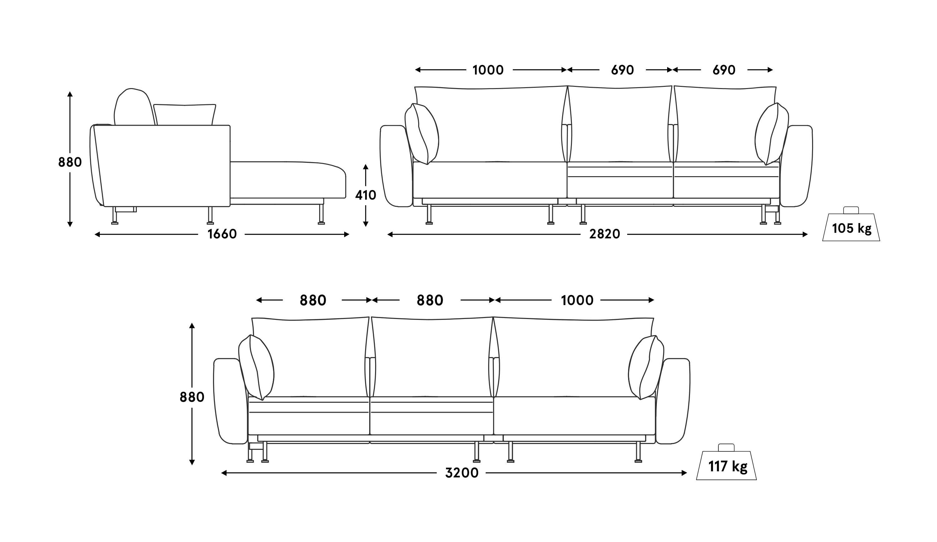 Kissen aus geschnittenem Silikon- und Polyurethanschaum gleichzeitig sorgen für Weichheit und Flauschigkeit der Rückenlehne sowie sein angemessenes Volumen und Elastizität. Fabric -Laminating verhindert, dass es sich falten und verformt, dank, dank dessen, dass das Sofa nach langem Gebrauch wie neu aussieht. Metallfüße mit Filzkissen sorgen für eine Stabilisierung des Sitzes auf jedem Boden und schützen vor dem Kratzer der Bodenfläche.