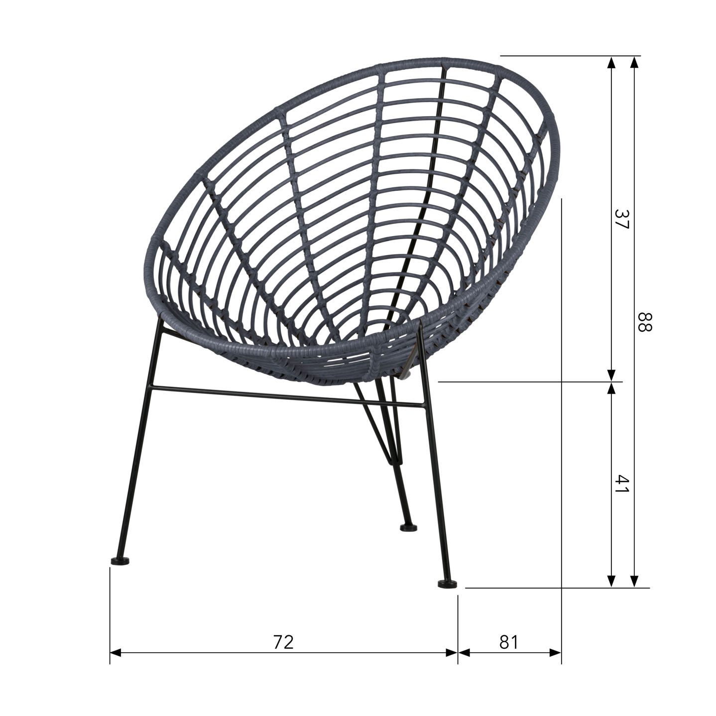 Der Metallrahmen, auf dem eine spektakuläre Rattan -Rückenlehne und ein Sitzplatz platziert sind, garantiert Stabilität und Komfort des Gebrauchs. Sessel In der Inkjet -Farbe funktioniert sie in allen skandinavischen, rustikalen und Boho -Innenräumen hervorragend. Das Material, aus dem die Möbel hergestellt werden, ist auch draußen geeignet, weshalb es auf der Terrasse, dem Garten oder dem Balkon arbeitet.