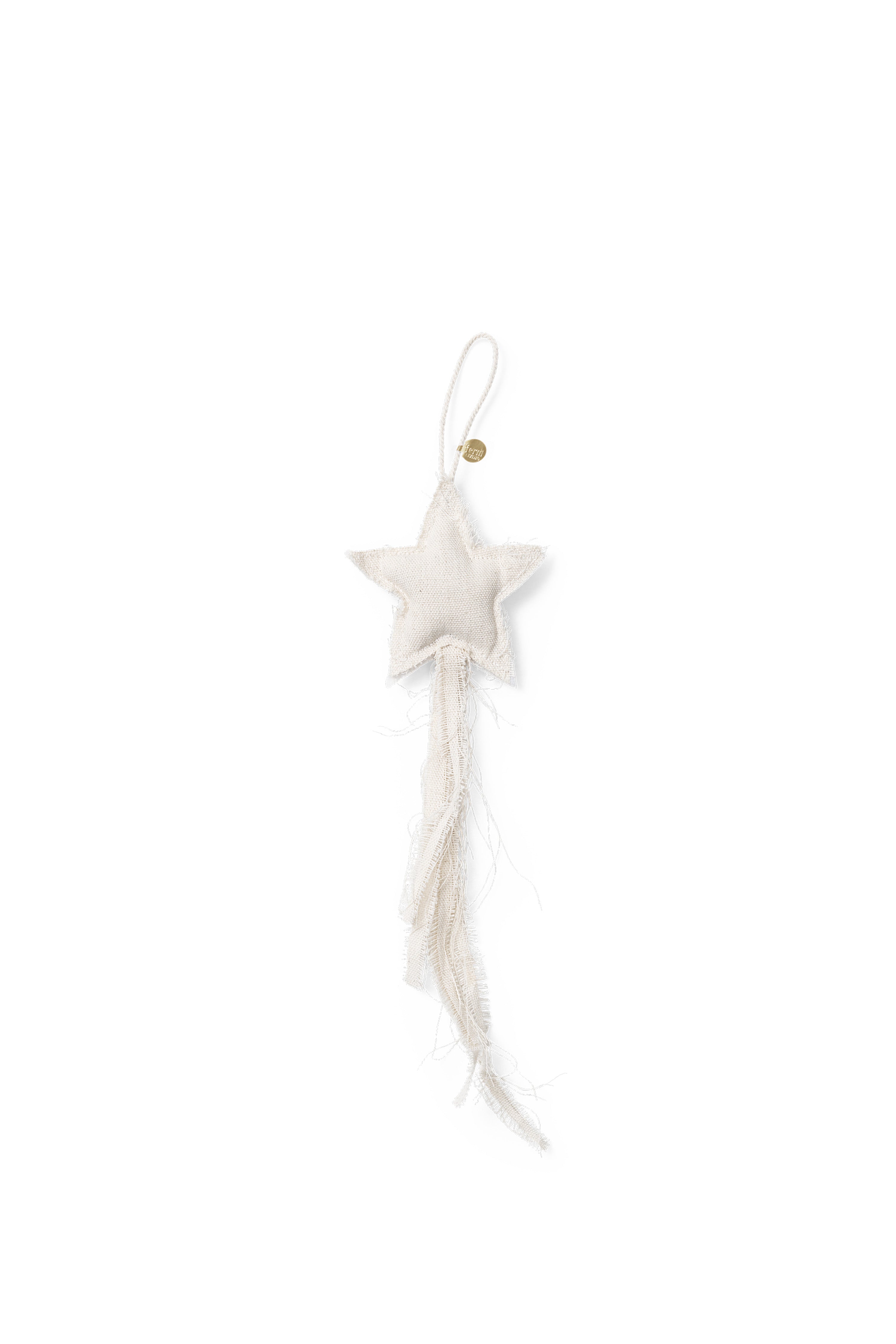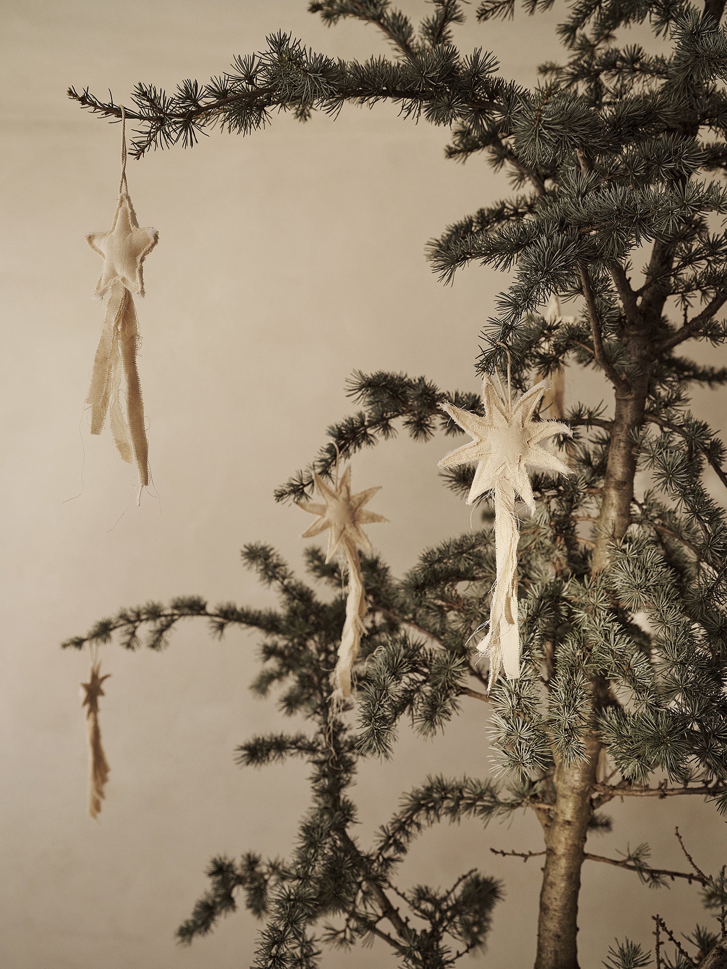 Zestaw dekoracji świątecznych Vela to cztery urocze gwiazdy wykonane z naturalnego, niebarwionego płótna bawełnianego, które przywołują ciepło i prostotę domowych dekoracji świątecznych. Ich subtelna tekstura i frędzlowe wykończenia nadają im lekkości oraz rękodzielniczego uroku. Każda gwiazda posiada aplikację wewnętrznej gwiazdy oraz miękkie wypełnienie z recyklingowanego poliestru, które dodaje objętości i wyjątkowej struktury. Zawieszone na choince lub gałązce, wprowadzą do wnętrza naturalny i przytulny klimat świąt