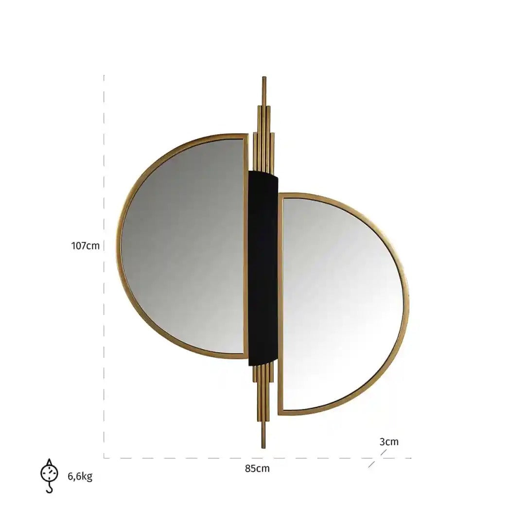 Modernes Spiegel Adelyn in geometrischer Form, das mit seinem künstlerischen Charakter und seiner Eleganz begeistert. Die Kombination aus zwei halbrunden Platten, die in einem gebürsteten goldenen Rahmen eingelassen sind, mit einem zentralen schwarzen Element und vertikalen Verzierungen, schafft eine beeindruckende Wanddekoration. Dies ist ein einzigartiges Accessoire, das einen Hauch von Luxus und raffiniertem Stil in Ihr Zuhause bringt.