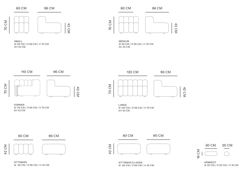 Das Set besteht aus dem großen Modul, dem mittleren Modul, dem Eckmodul, dem kleinen Modul, zwei Osmanischen, zwei osmanischen Klassiker und drei Armlehnen.