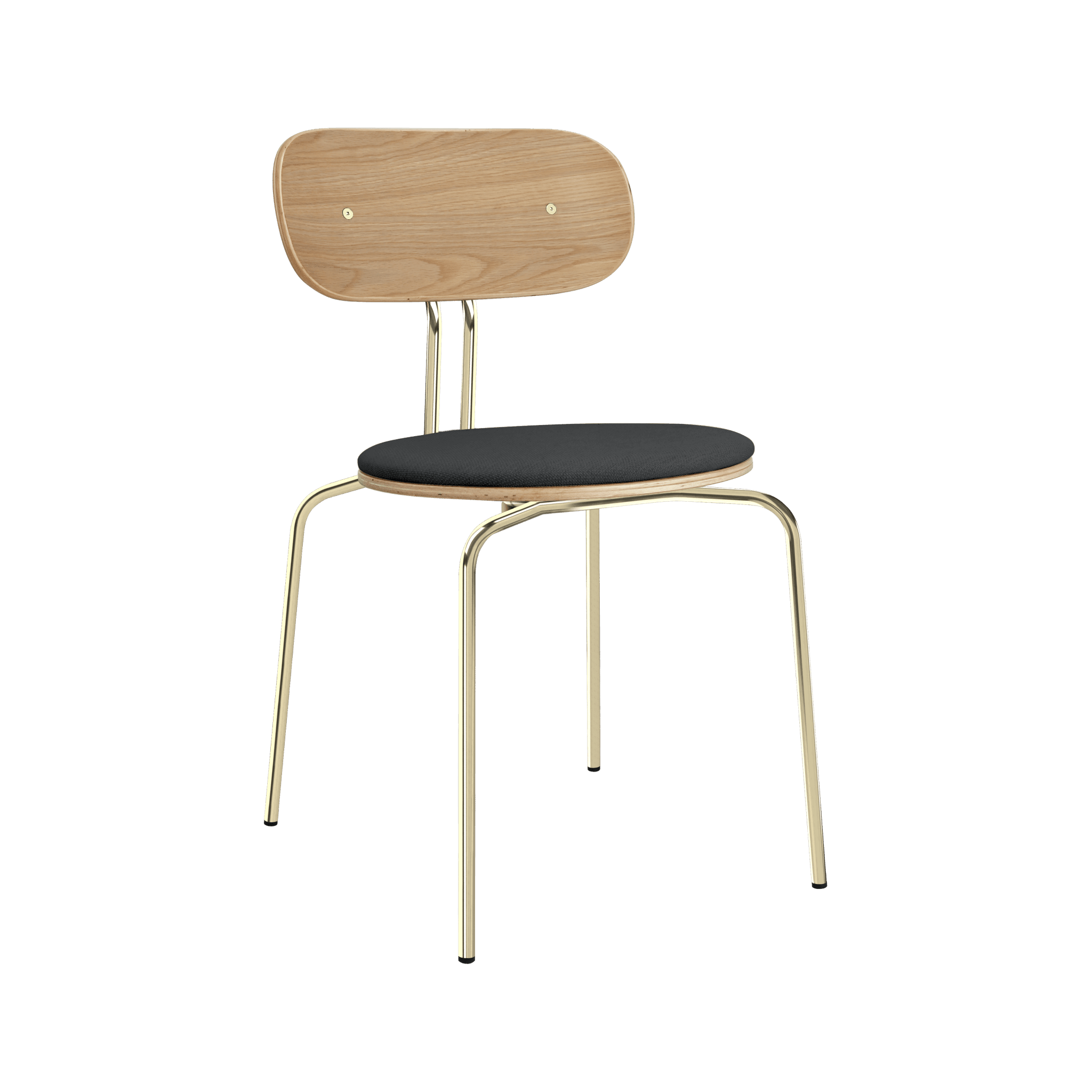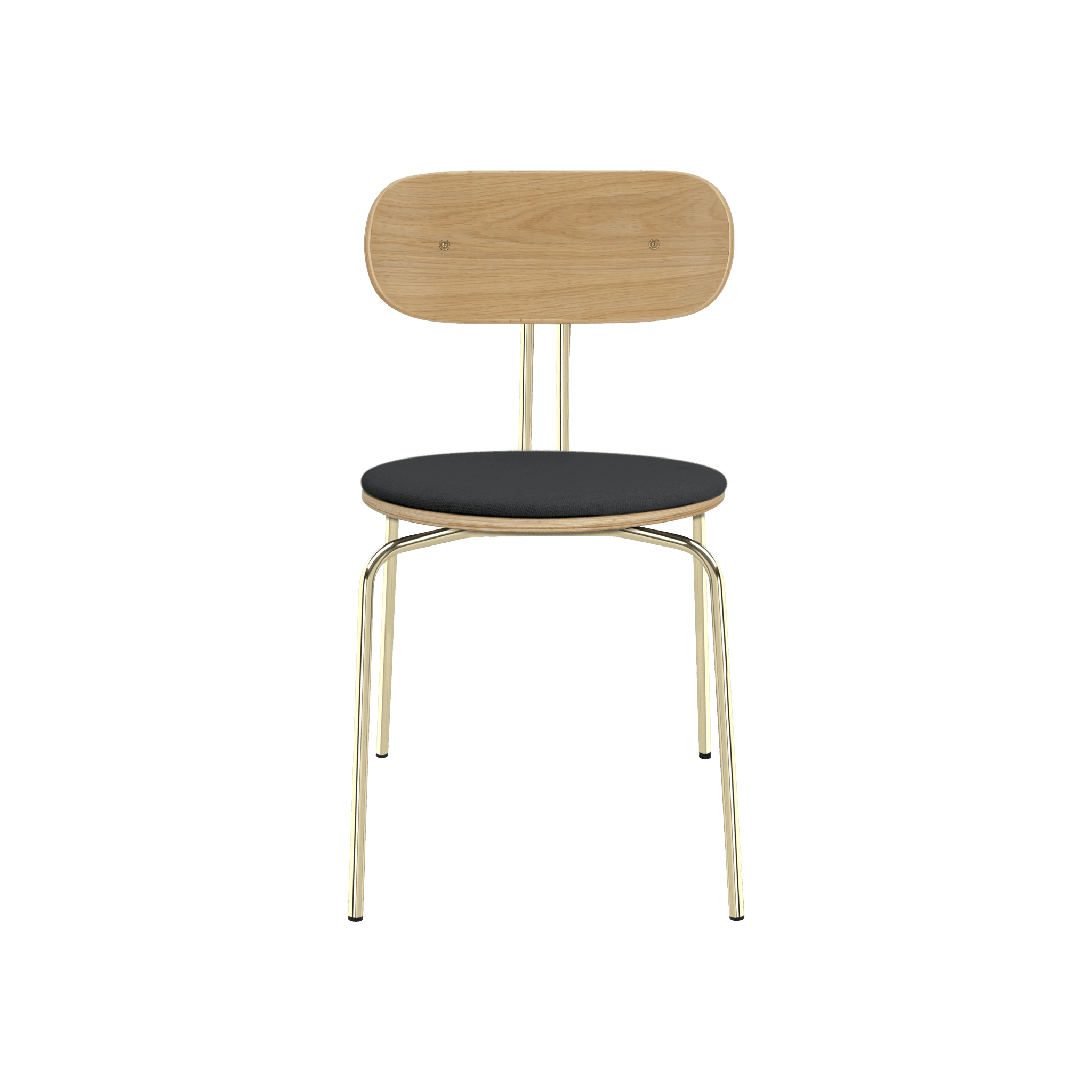 Stuhl Neugierig ist elegant, leichte und minimalistische Möbel aus Eichenfurnier. Es ist mit Messing- oder schwarzen Beinen erhältlich, und das optionale Sitzkissen bietet zusätzlichen Komfort. Sie können ein Kissen aus 17 Farben des Horizons -Stoffes auswählen, die 100% recycelt sind, sowie in einem braunen oder weißen Schatten mit Teddybärenstoff.