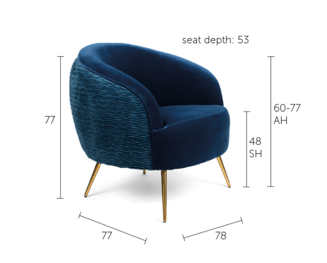 Dünn, schlank, Messing Die Beine balancieren die übertriebene Form des Stuhls und bringen sie in geschmackvolles Design ein. Allein oder als Paar wird es sein Visueller Bezugspunkt für jeden Raum.
