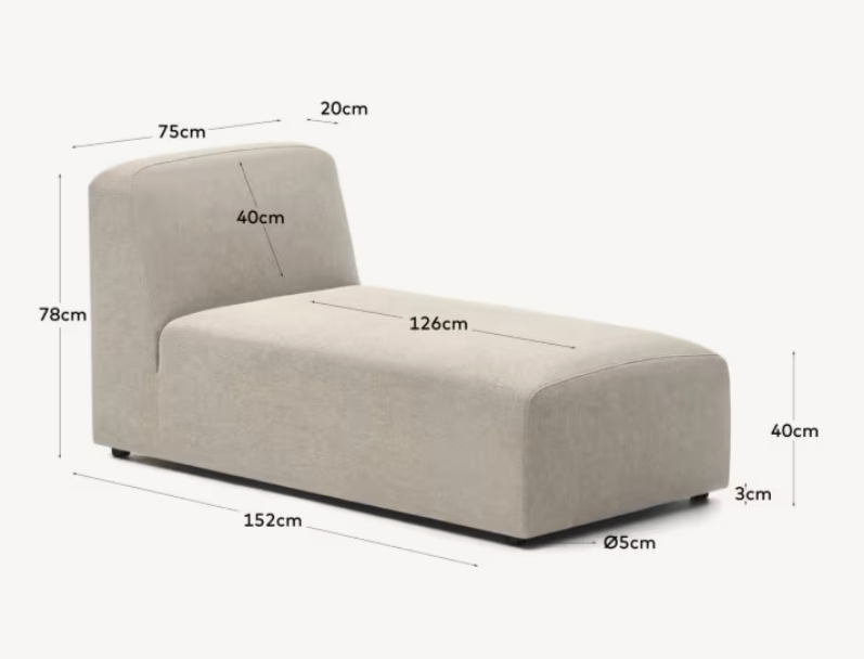 Beige Chaise Noem verleiht der Kollektion nicht nur Komfort, sondern betont auch ihre Vielseitigkeit. Dieser Chaiselong passt nicht nur ohne Anstrengung in den Rest der Module, sondern ist auch eine einzigartige Entspannungszone. Sein ergonomisches Design garantiert maximalen Komfort während der Ruhe, während er einen subtilen, luxuriösen Akzent in das Innere einführt.