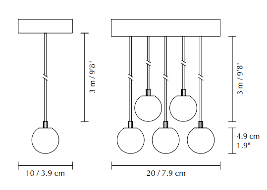 The set also includes canopy hooks, which guarantee a flexible distance between each lampshade, giving the possibility of individual adaptation of the lighting arrangement.