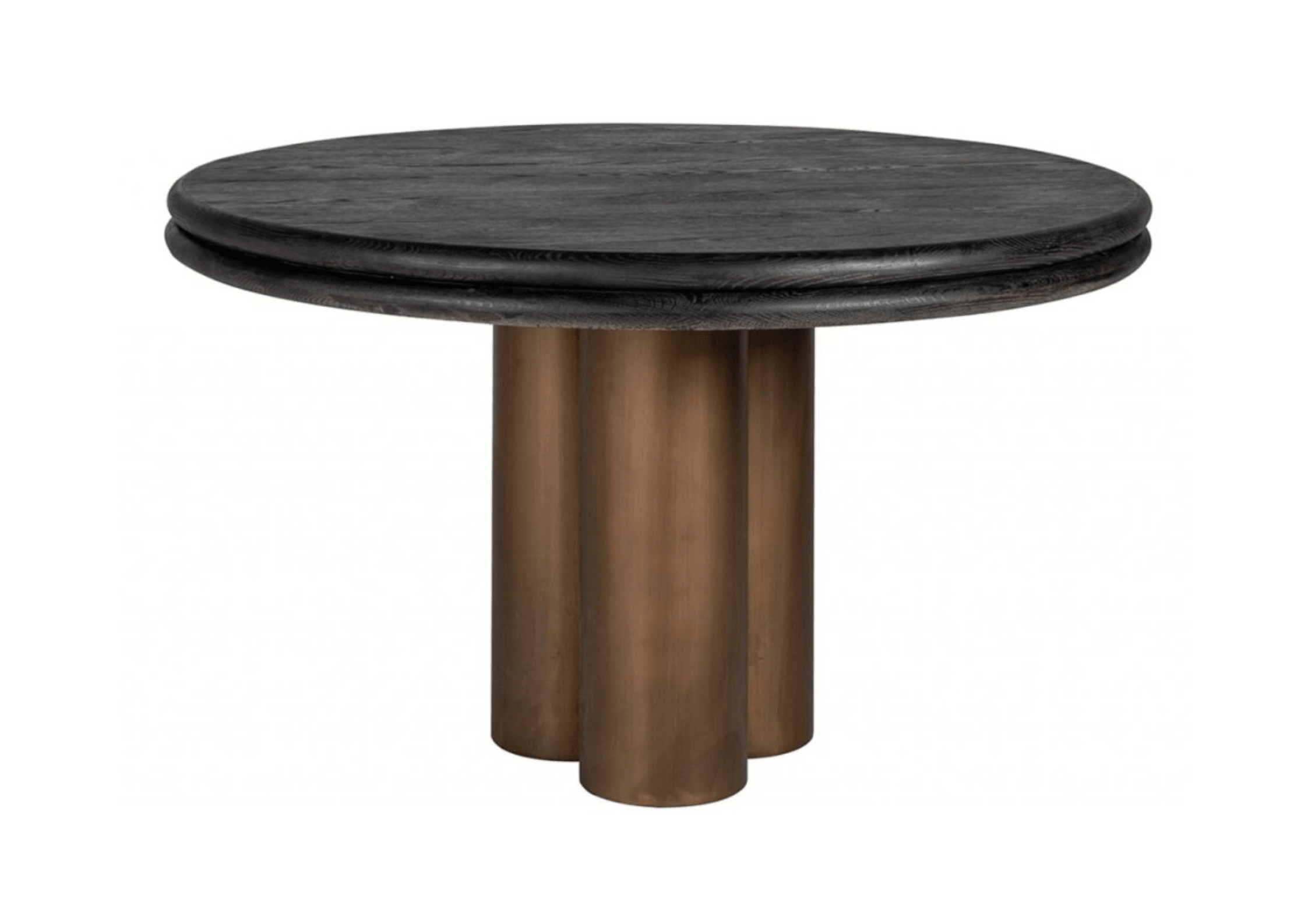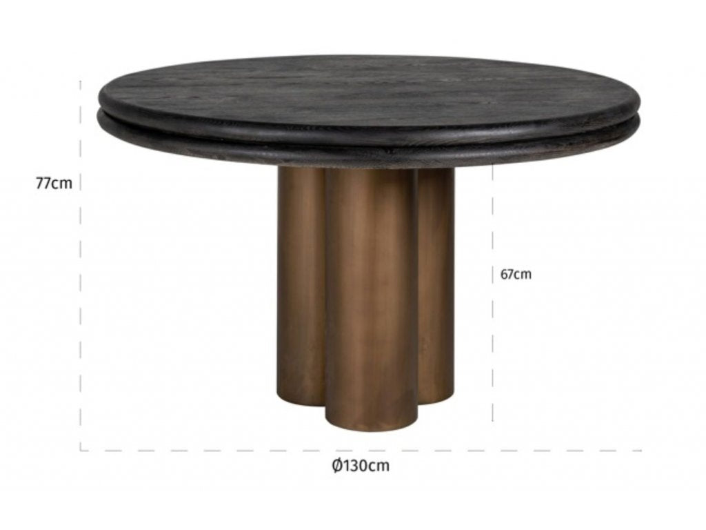Dining table The round macaron in shades of dark brown and brass is a great choice for those who value unique design and elegance. This lavish table was created using metal in the color of aged brass and dark brown finish. The table top was decorated with beautiful oak wood, creating a harmonious and effective composition.