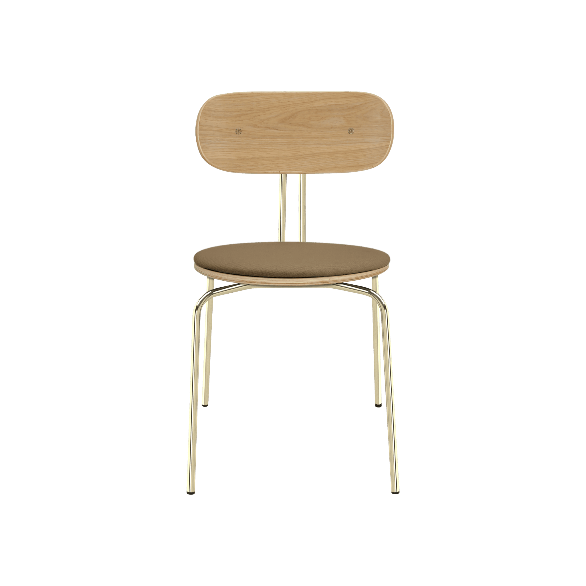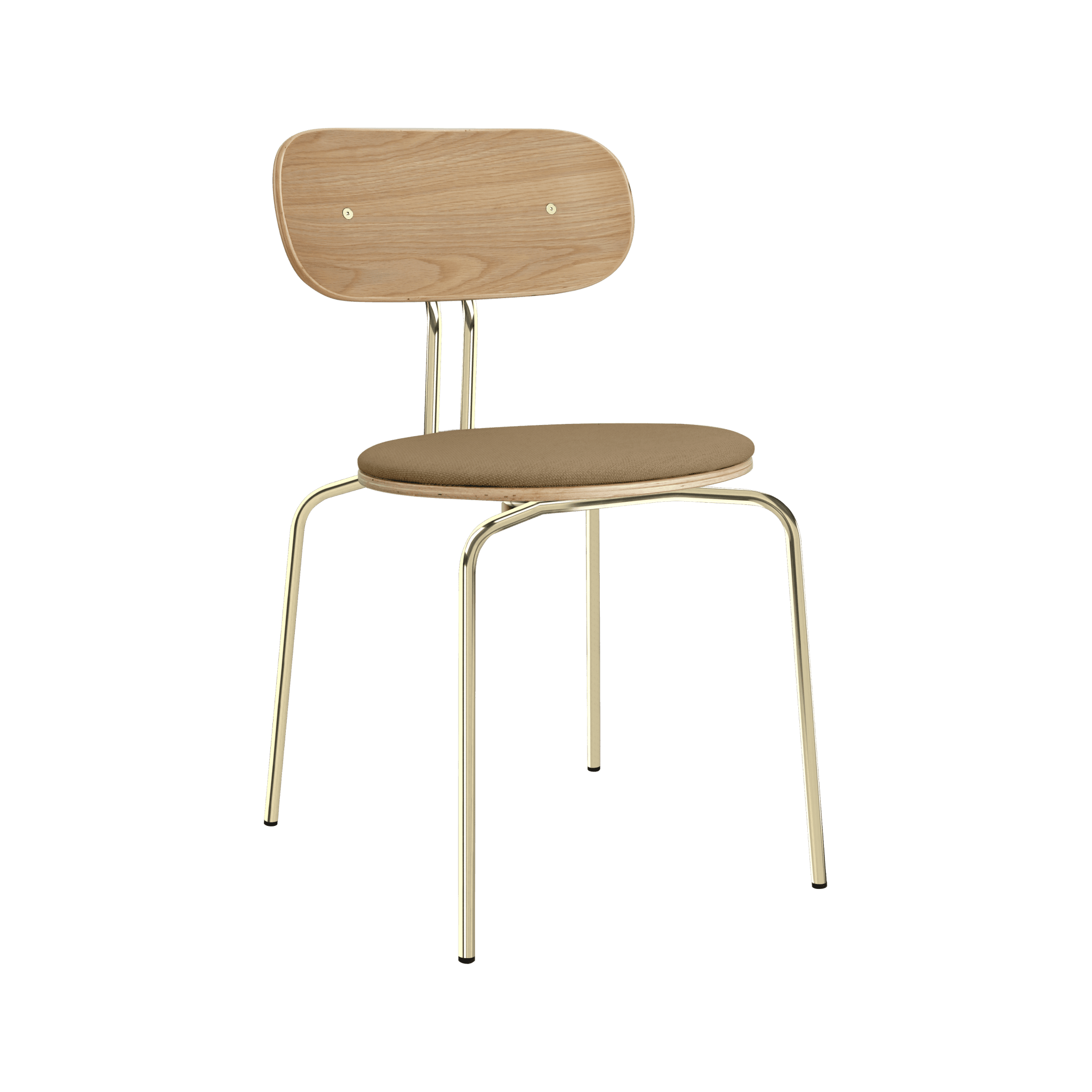 Krzesło Curious to eleganckie, lekkie i minimalistyczne meble, wykonane z forniru dębowego. Jest dostępne z mosiężnymi lub czarnymi nogami, a opcjonalna poduszka siedziska zapewnia dodatkowy komfort. Można wybrać poduszkę spośród 17 kolorów tkaniny Horizons, wykonanej w 100% z recyklingu, a także w brązowym lub białym odcieniu tkaniny Teddy Bear.