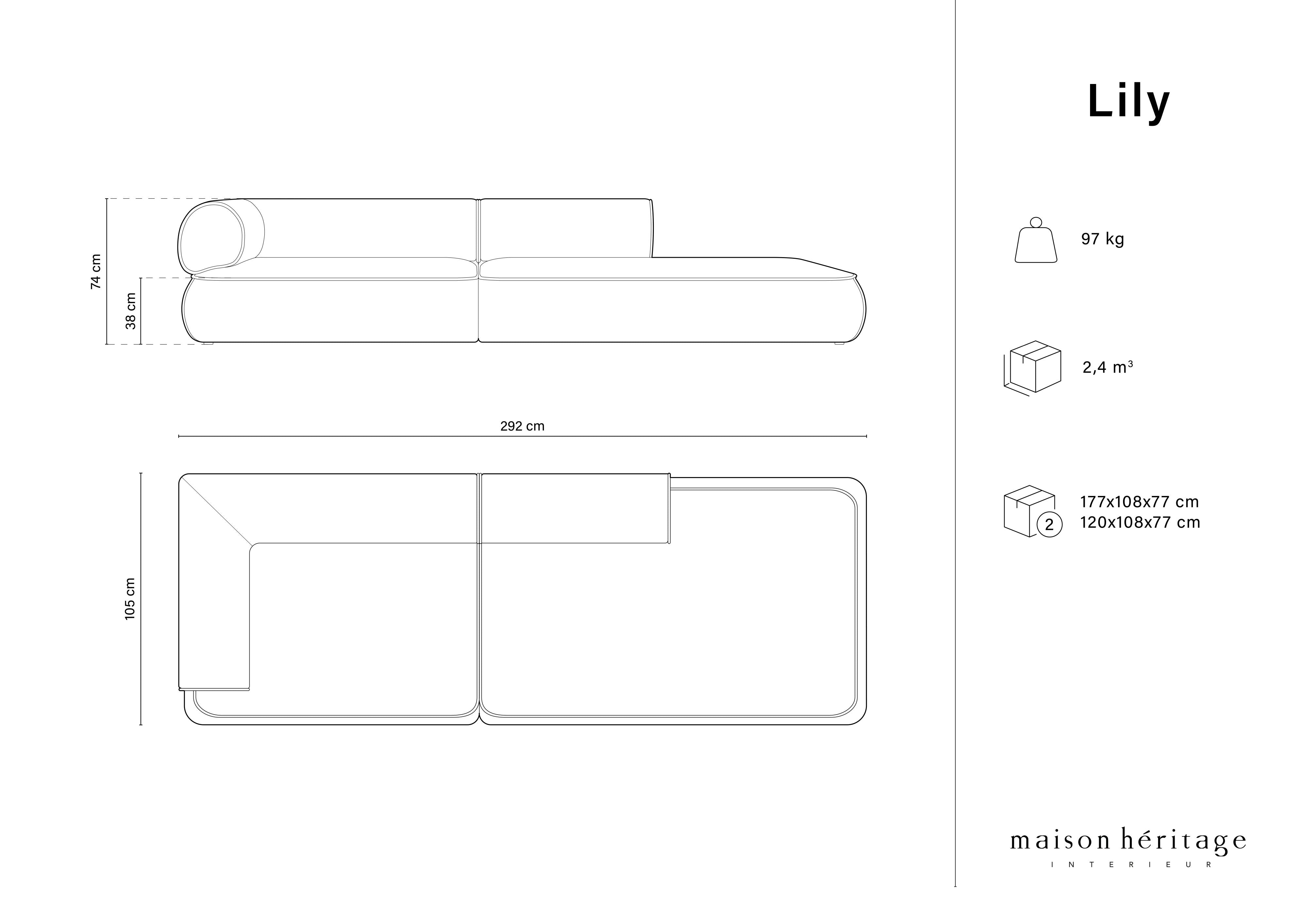 Głębokie siedziska są sprężyste i wyjątkowo wygodne. Delikatne pikowania i przeszycia podkreślają klasyczny charakter projektu. Dzięki niskiej i rozłożystej sylwetce sofa Lily wprowadzi do wnętrza odrobinę przytulności i ciepła. W kolekcji dostępne są różne kombinacje sof i narożników, a także szezlong i duża pufa, dzięki którym można stworzyć niepowtarzalny wystrój.