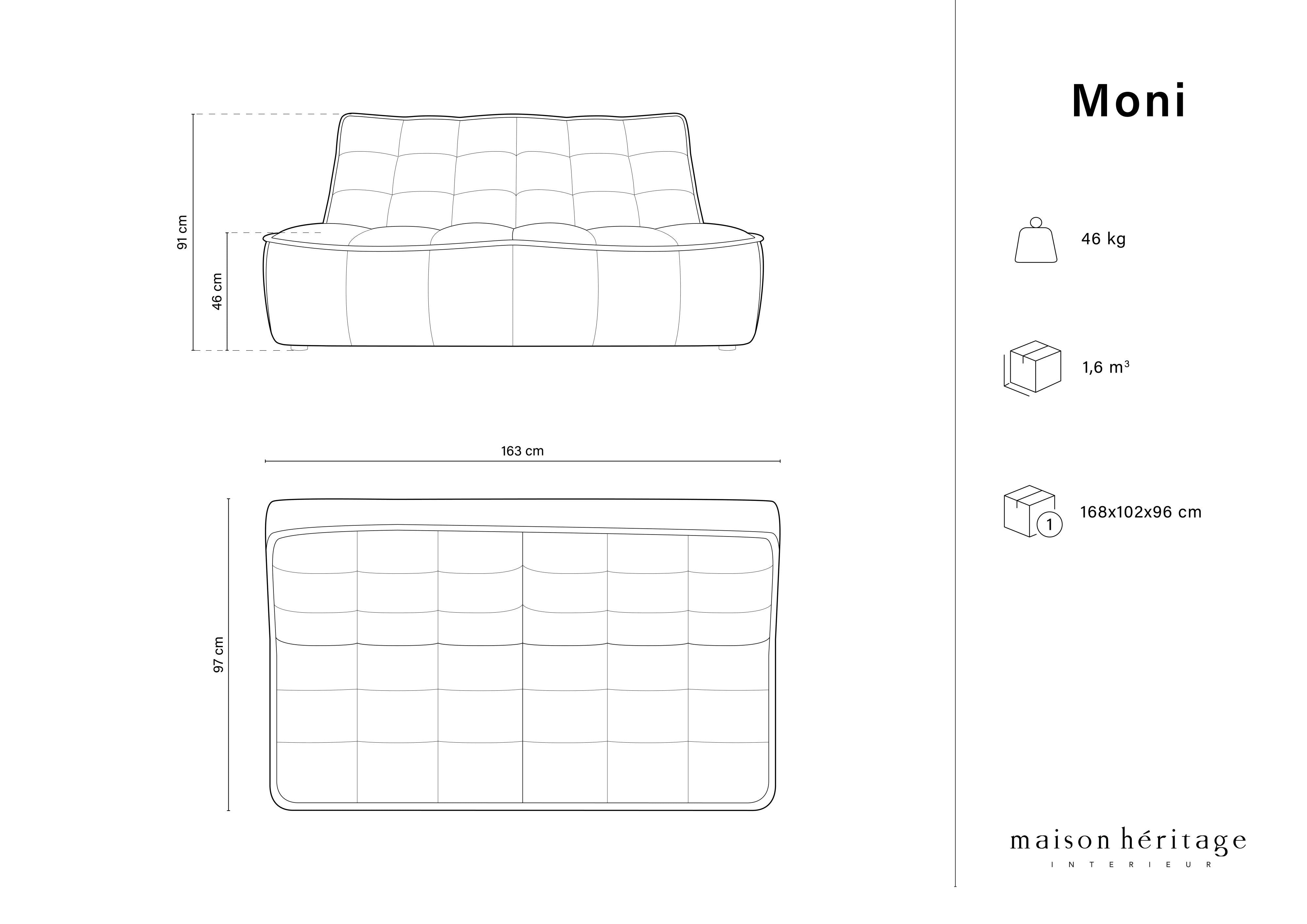 Sofa dla dwóch osób Moni definiuje funkcjonalność i wygoda w połączeniu z nowoczesnym designem. Stylowe pikowanie i oryginalna bryła świetnie sprawdzą się zarówno w eleganckim salonie, jak i w nowoczesnym biurze. Linia siedziska i oparcia jest wygięta w łuk i posiada delikatnie wyprofilowane wgłębienie, oferujące niezwykły komfort użytkowania.