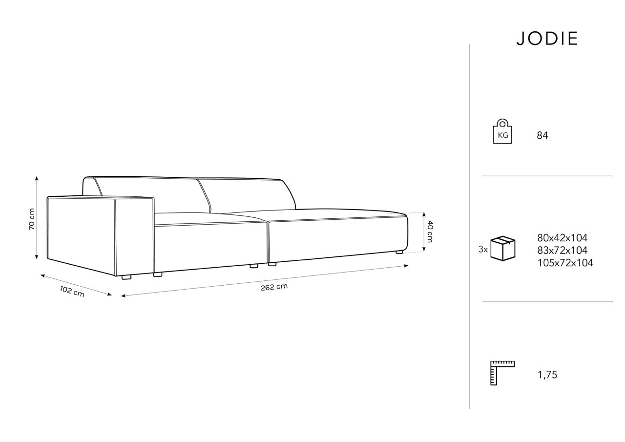 Jodie to nowoczesna, jednostronnie otwarta sofa z miejscem dla trzech osób. Sofa została zaprojektowana z myślą o funkcjonalności i wygodzie użytkowania. Możliwość wyboru lewej lub prawej strony otwarcia pozwala na dostosowanie sofy do indywidualnych potrzeb i preferencji.