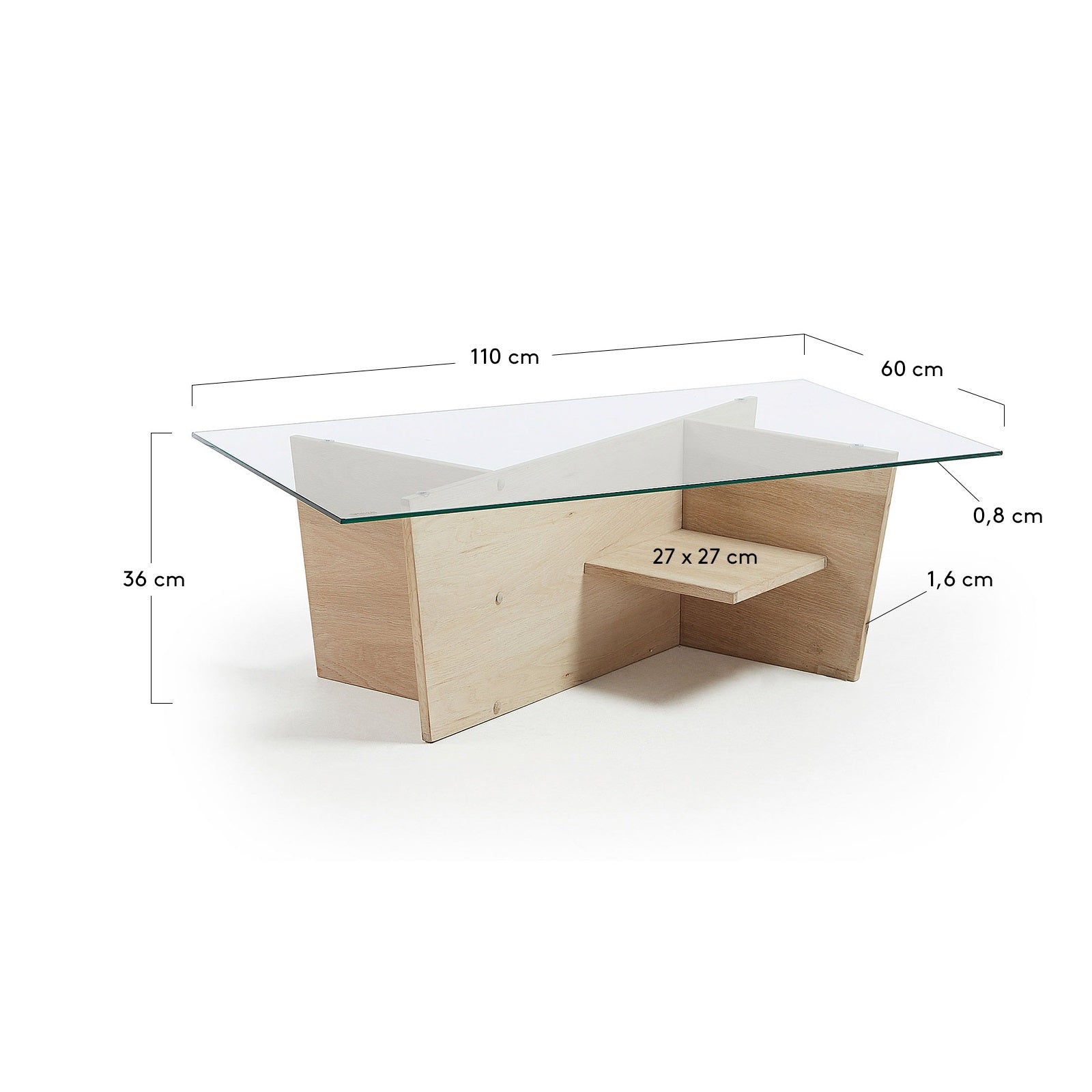 Stolik kawowy BALWIND szklany z drewnianą podstawą