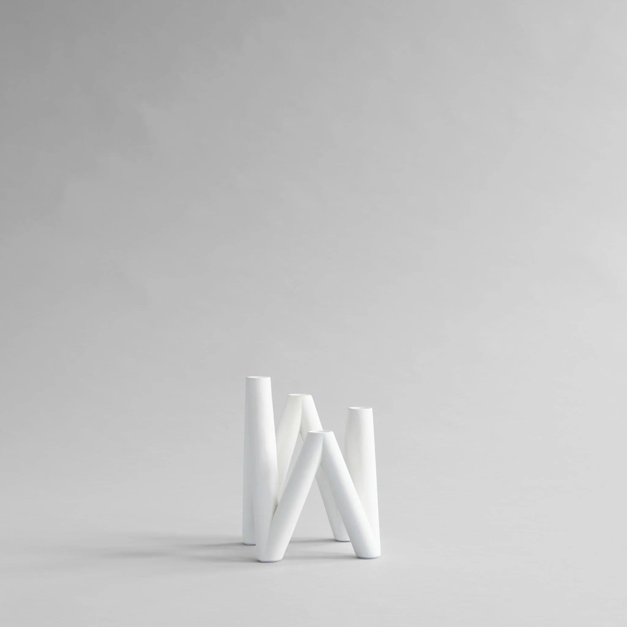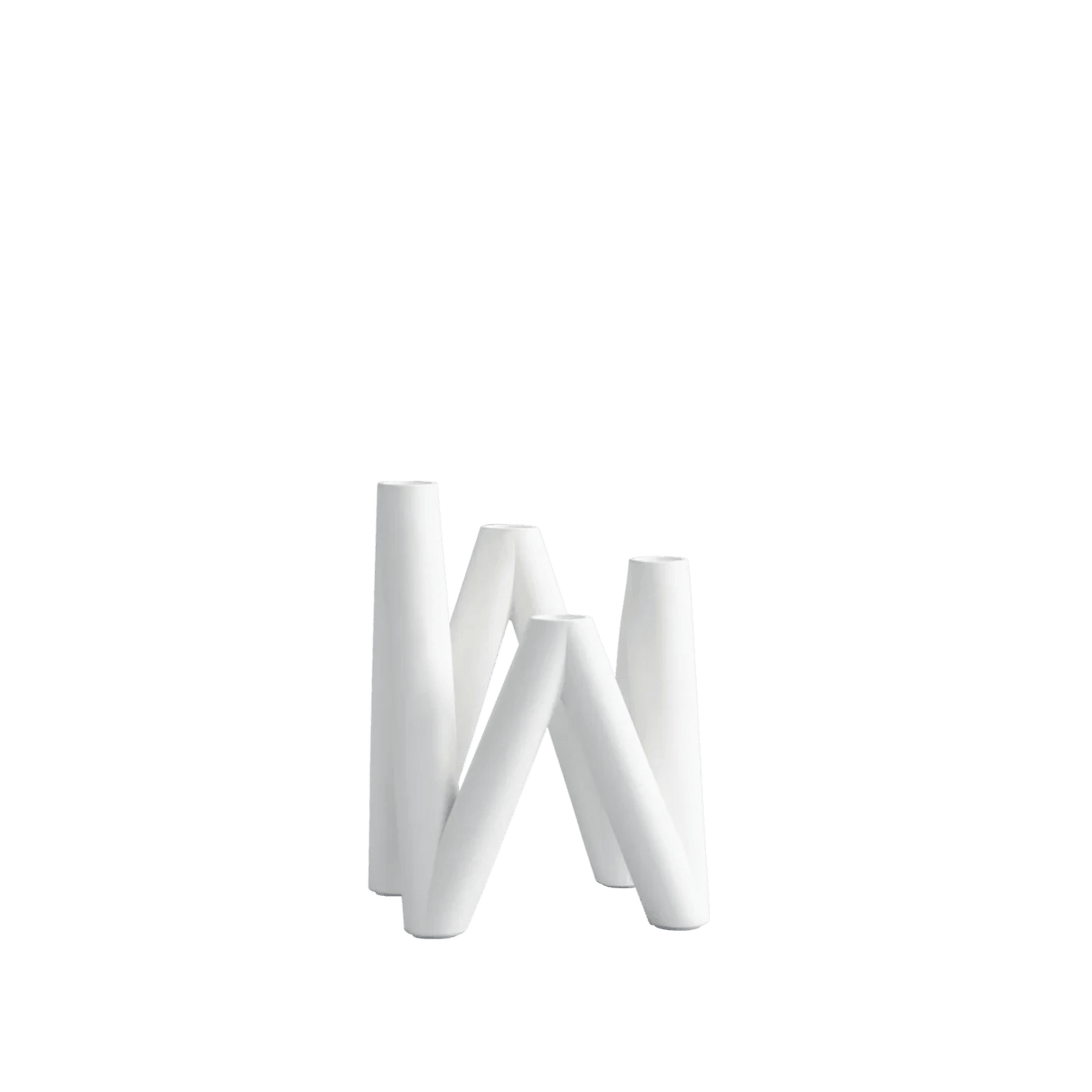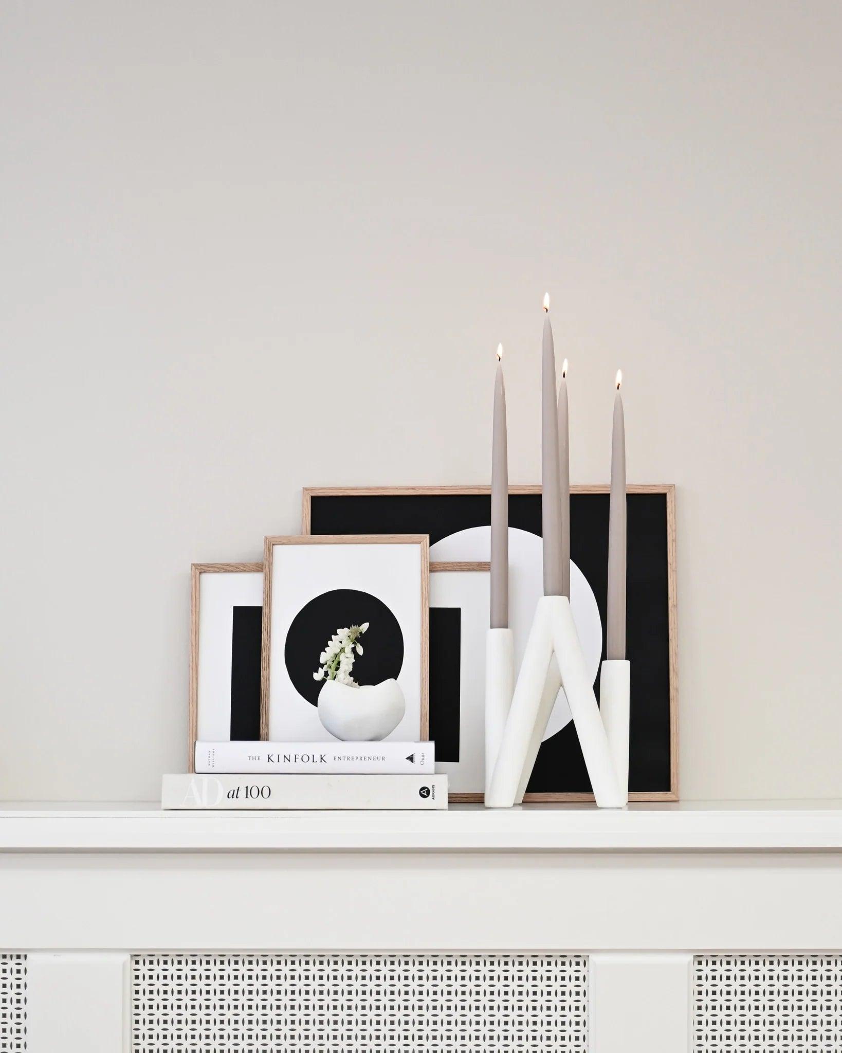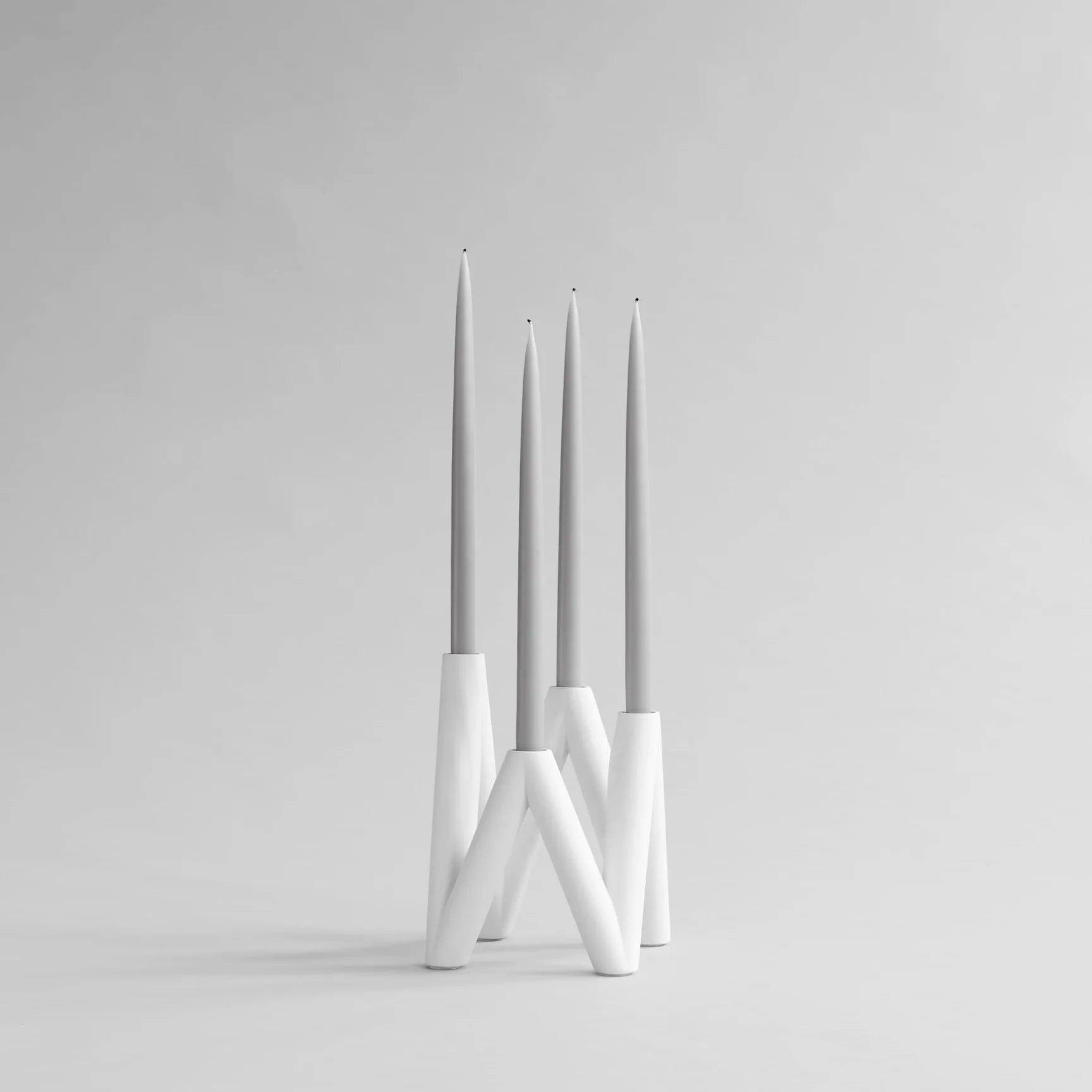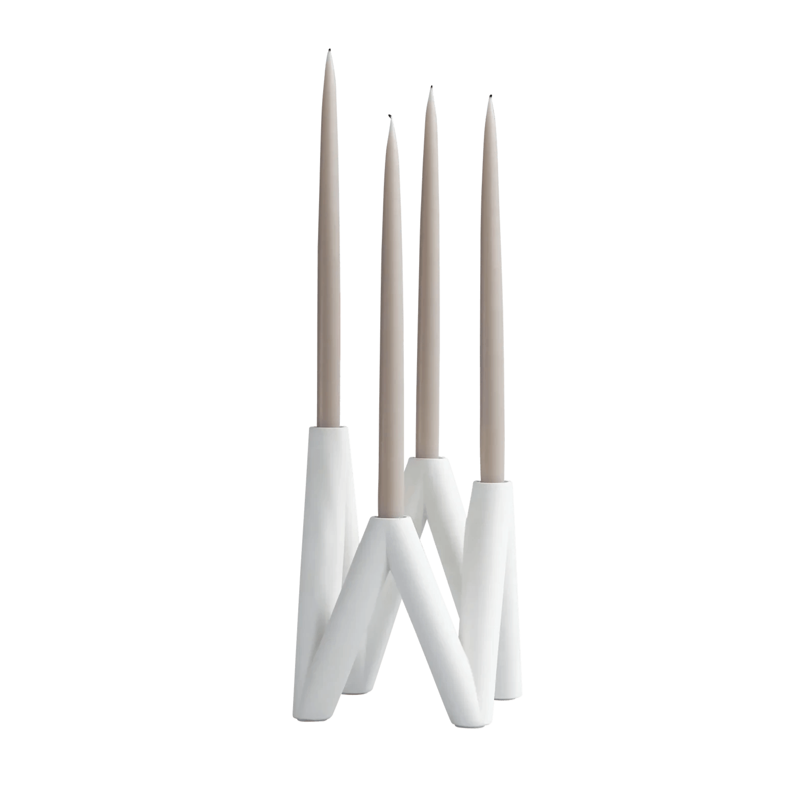 Zainspirowany brutalistyczną architekturą, świecznik W to urzekający zestaw przechylnych kolumn, które zderzają się pod ostrymi kątami. Ten wyjątkowy projekt czerpie z zasad brutalizmu, znanego z surowej, szczerej i imponującej estetyki. Dzięki zastosowaniu różnych matematycznych kątów punkt zderzenia kolumn ma różną wysokość, co daje efektowną wizualnie i dynamiczną kompozycję. Mocną ekspresję graficzną świecznika W uzyskano poprzez zestawienie tych kanciastych elementów. Każda kolumna, starannie wykonana z precyzją, ukazuje wyraźny kąt, który zwiększa ogólną złożoność kompozycji. Wzajemne oddziaływanie kolumn stwarza wrażenie ruchu i napięcia, oddając istotę architektury brutalistycznej.