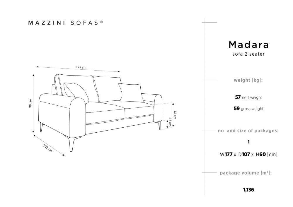 Sofa dla dwóch osób Madara to kwintesencja nowoczesnego minimalizmu. Głębokie siedzisko w połączeniu z wygodnymi poduchami na oparciu i poręcznymi podłokietnikami jest gwarancją niezwykłego komfortu użytkowania. Aksamitne wykończenie jest nie tylko przyjemne w dotyku, ale również odporna na ścieranie, co minimalizuje ryzyko uszkodzeń.